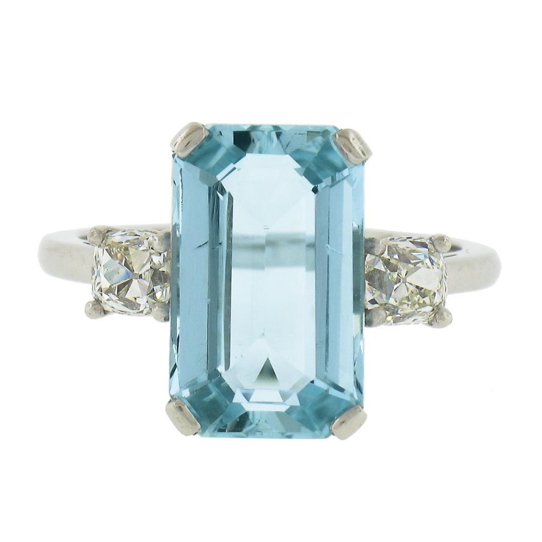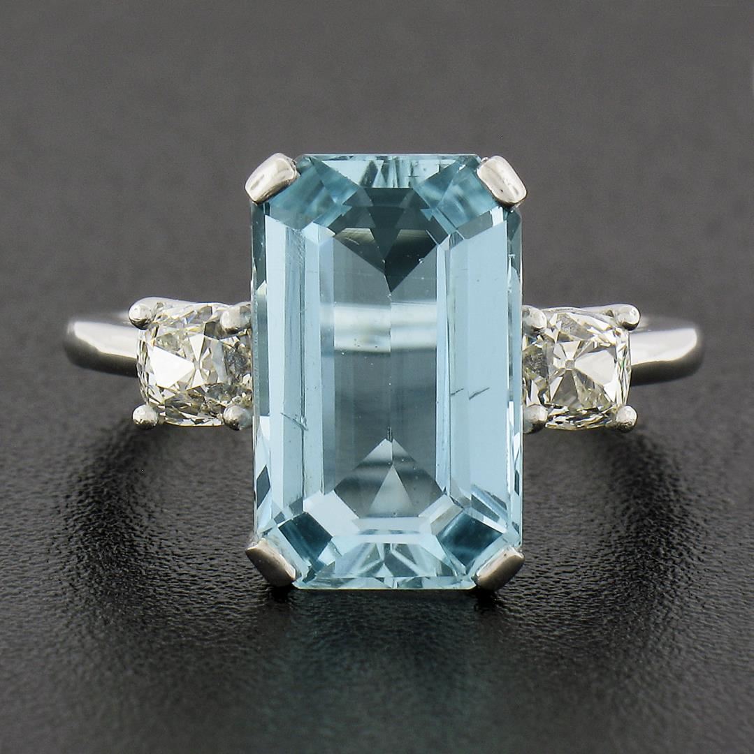 A new solid platinum cocktail ring, with 1 elongated step cut natural aquamarine (3.86ct), and 2 old mine cut natural diamonds (K/L - VS1/VS2 ; 0.69ctw ). The ring is size 6.5, weighs a total of 5.63 grams, and measures 12.8mm wide.