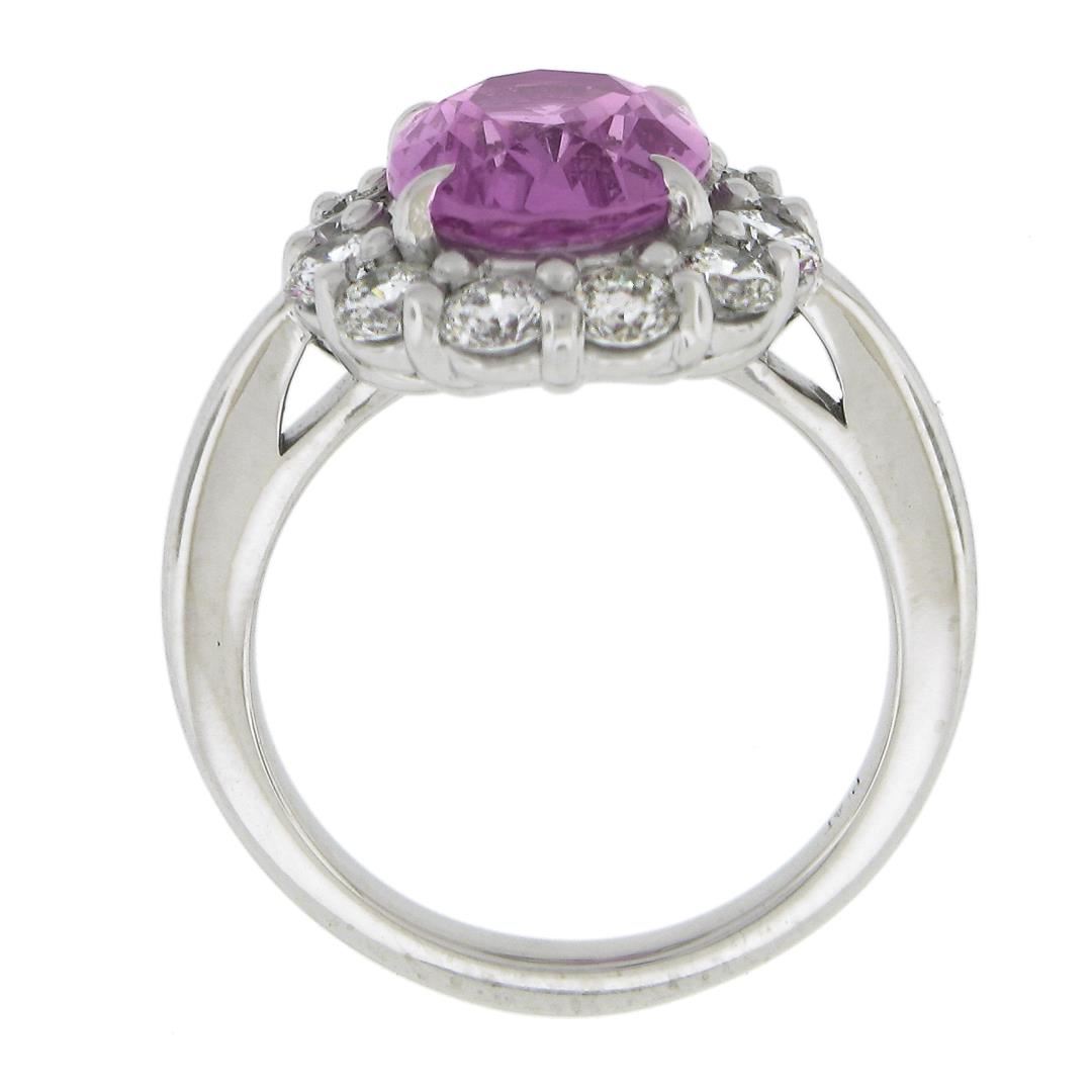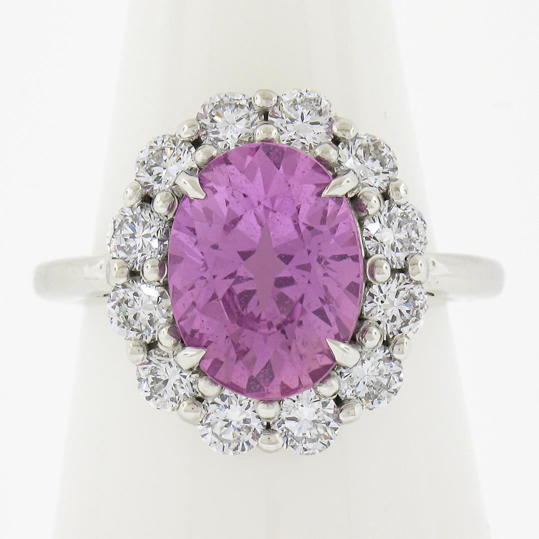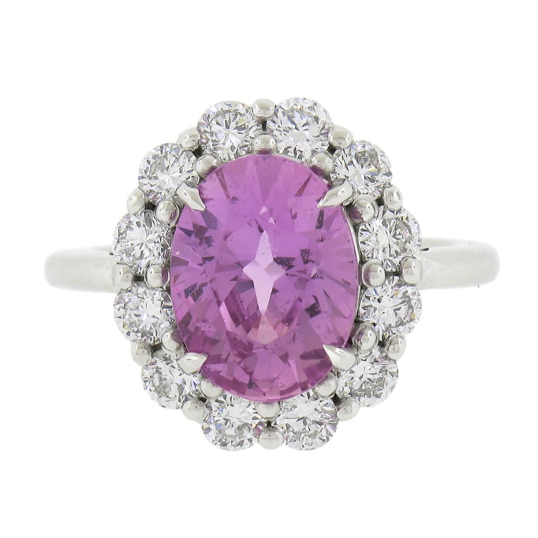 A solid new platinum ring, with 1 GIA graded oval cut natural pink sapphire (4.31ct ), surrounded with a halo of 12 round cut natural diamonds (F/G - VS1/VS2 ; 1.33ctw). The ring is size 7.0, weighs a total of 10.06 grams, and measures 16.4mm wide. Comes with all original relevant certifications.