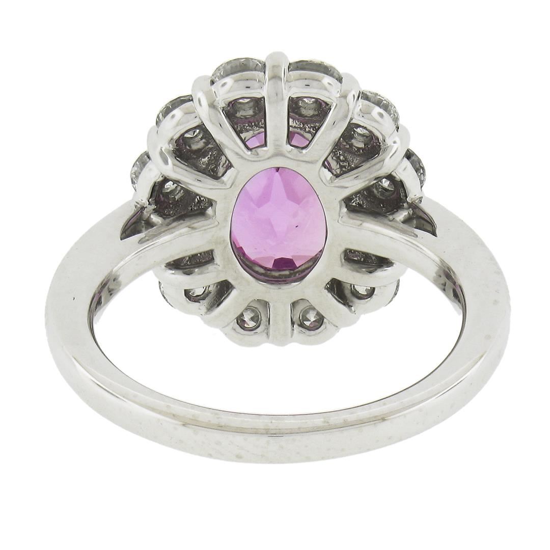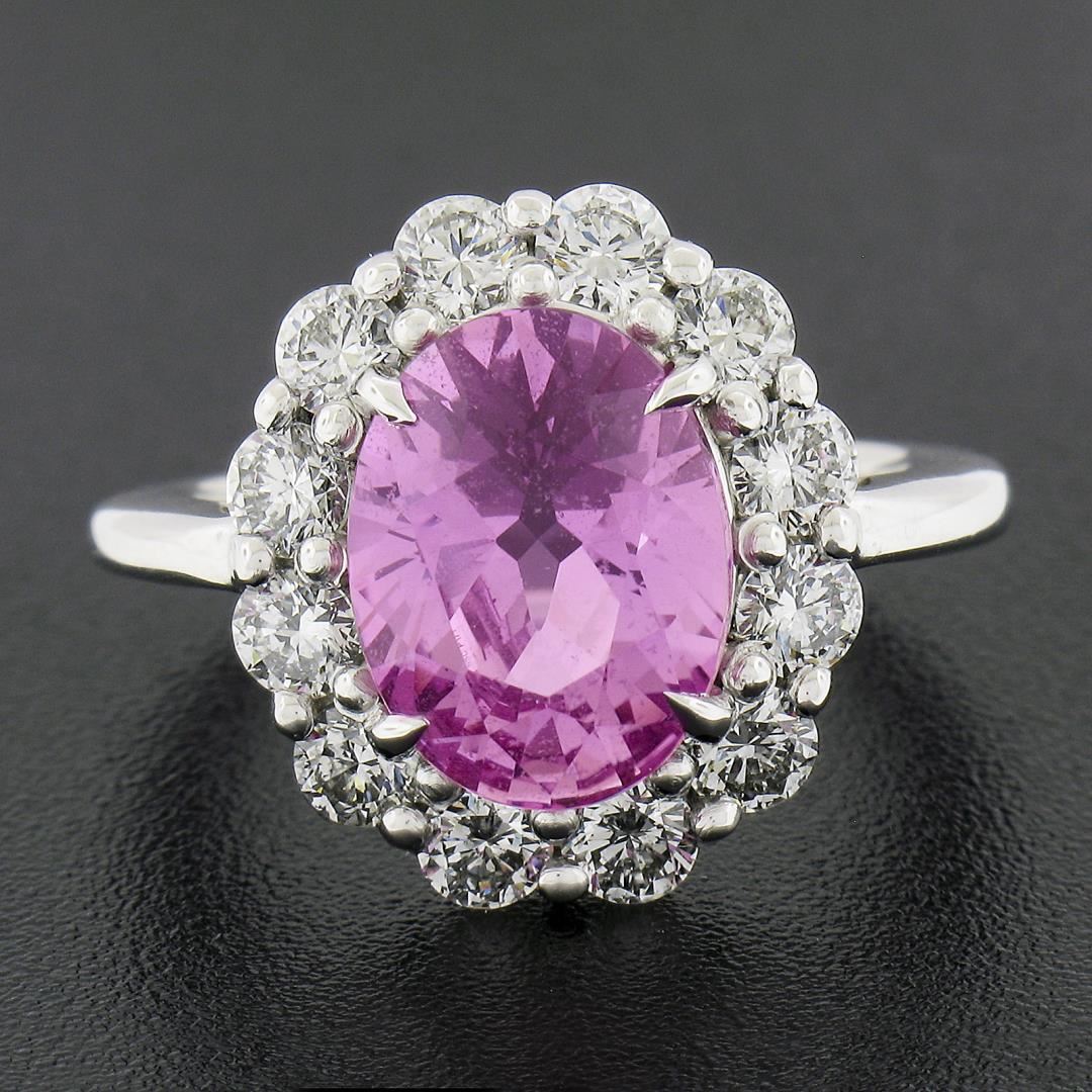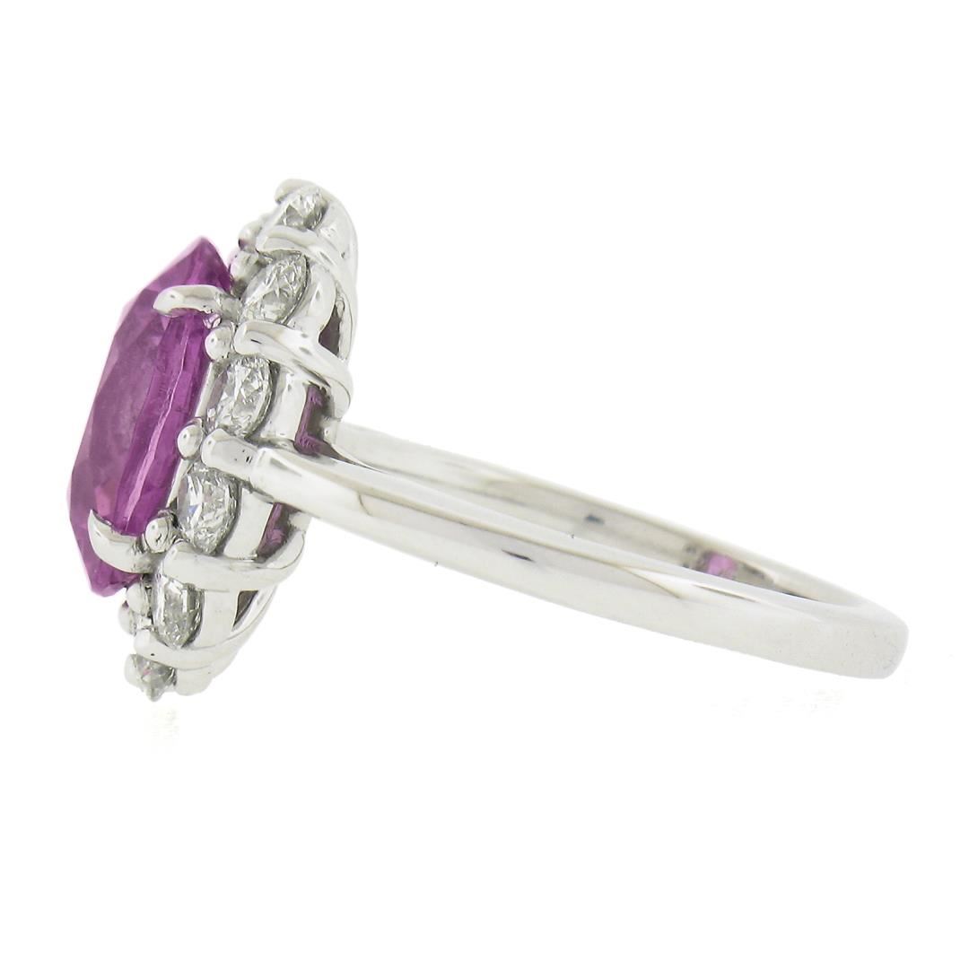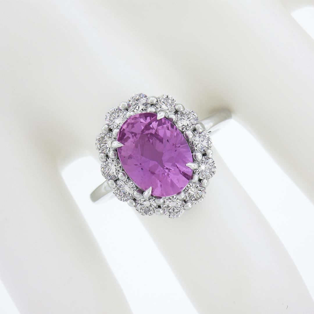 A solid new platinum ring, with 1 GIA graded oval cut natural pink sapphire (4.31ct ), surrounded with a halo of 12 round cut natural diamonds (F/G - VS1/VS2 ; 1.33ctw). The ring is size 7.0, weighs a total of 10.06 grams, and measures 16.4mm wide. Comes with all original relevant certifications.
