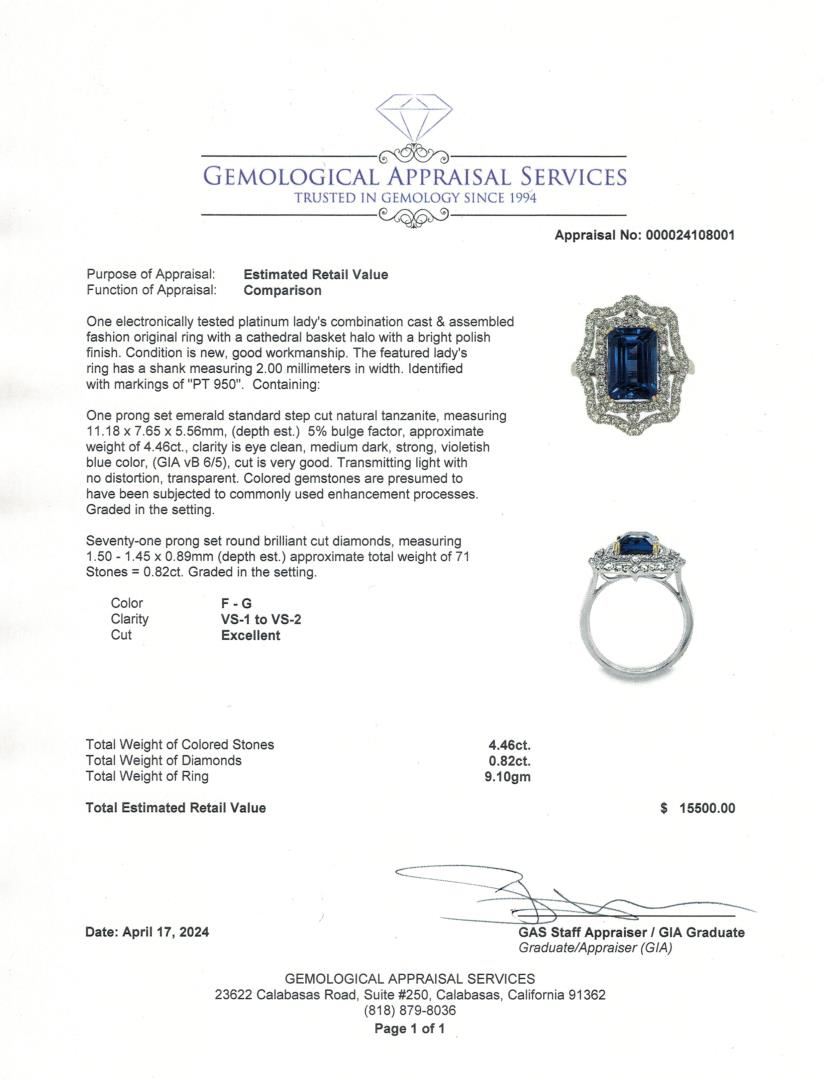 Crafted in platinum (PT 950), this elegant cathedral basket halo ring features a 4.46ct emerald standard step-cut natural tanzanite, prong-set and displaying a medium dark, strong, violetish blue color with eye-clean clarity. Surrounding the tanzanite are 71 prong-set round brilliant-cut diamonds, totaling 0.82ct, with F-G color, VS-1 to VS-2 clarity, and an Excellent cut. The 2.00mm shank width and bright polish finish enhance the sophisticated design of this statement piece. Appraised at $15,500, this ring is a stunning blend of luxury and brilliance.