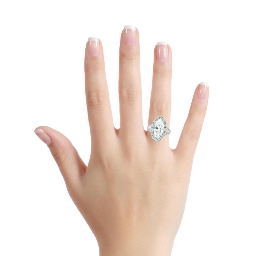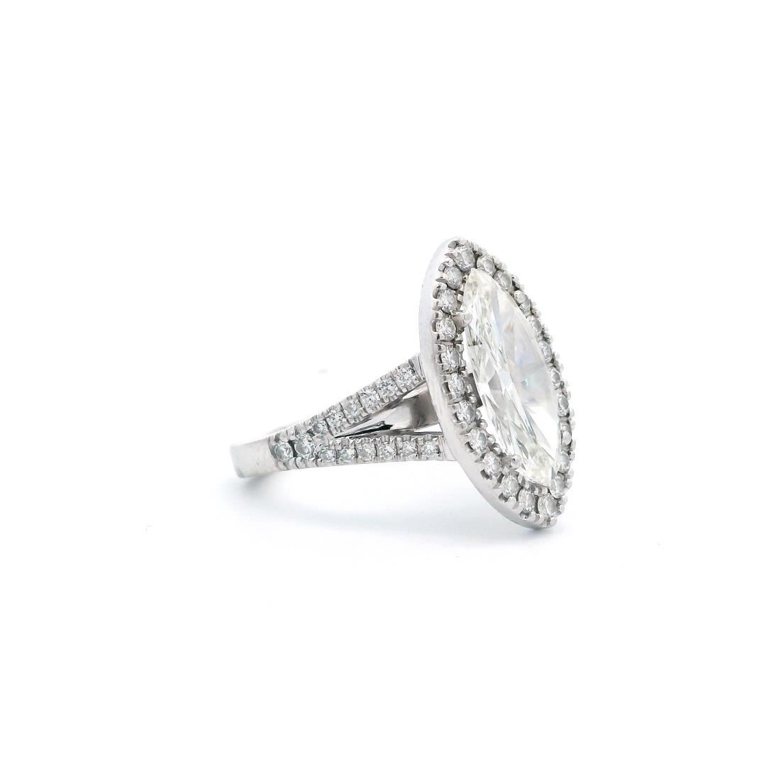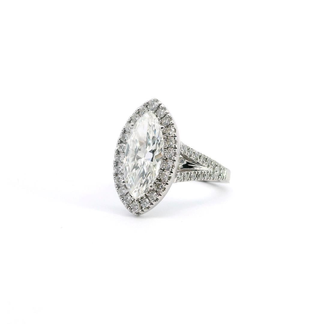 A platinum marquise halo wedding ring with a 3.02ct marquise-cut diamond of H color and SI-3 clarity. Surrounded by 0.66ct of round brilliant cut diamonds, graded VS-1 to VS-2 clarity, set in a Euro shank. The ring weighs 9.30gm and has a bright polished finish.