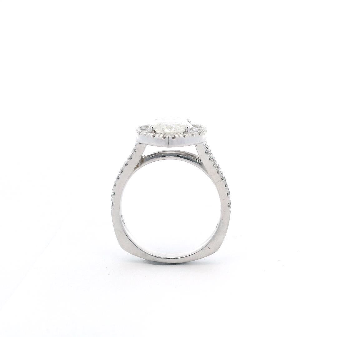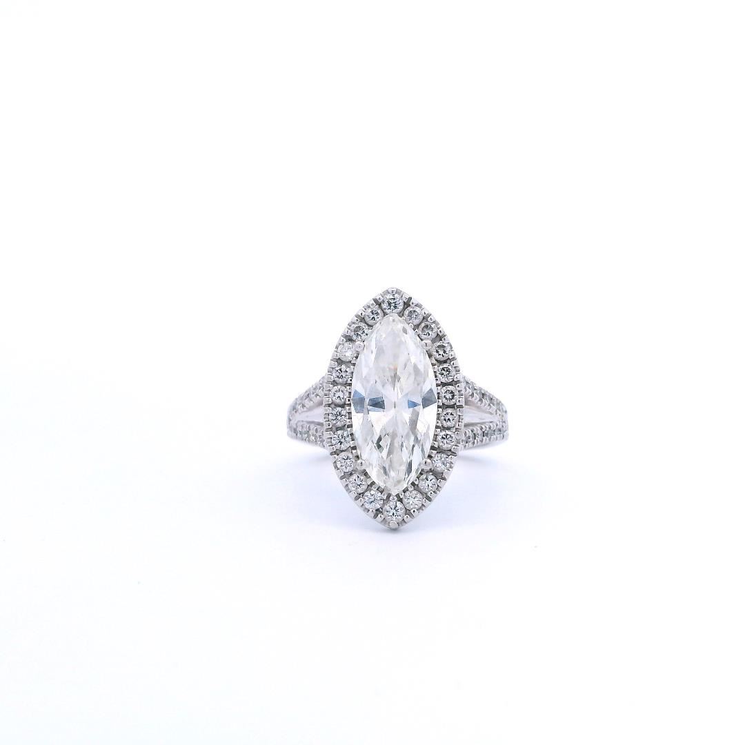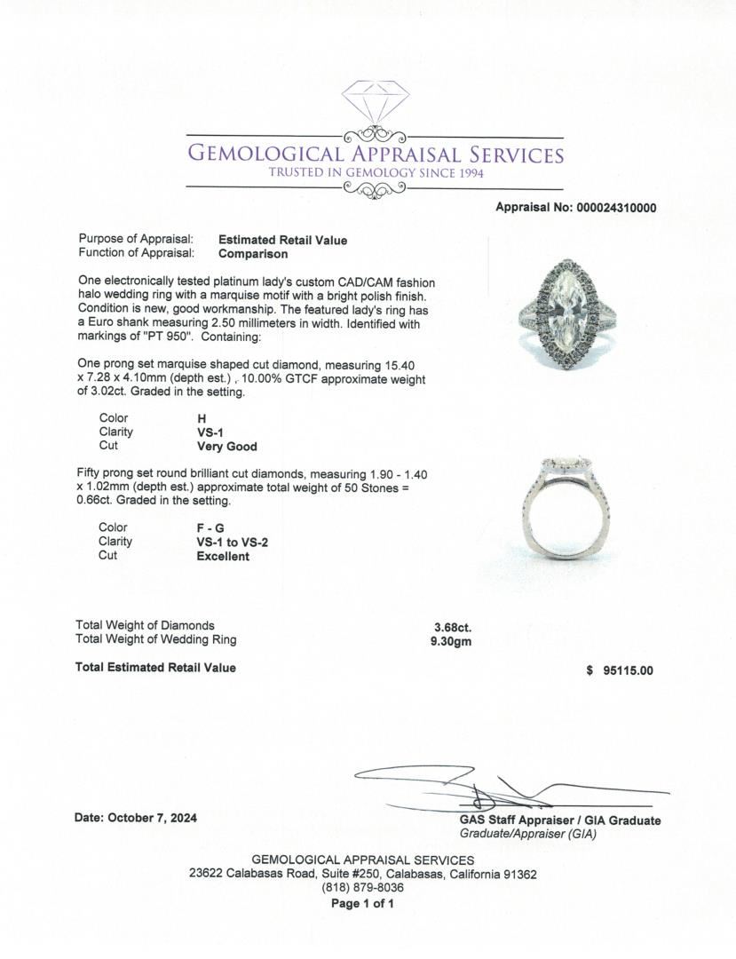 A platinum marquise halo wedding ring with a 3.02ct marquise-cut diamond of H color and SI-3 clarity. Surrounded by 0.66ct of round brilliant cut diamonds, graded VS-1 to VS-2 clarity, set in a Euro shank. The ring weighs 9.30gm and has a bright polished finish.