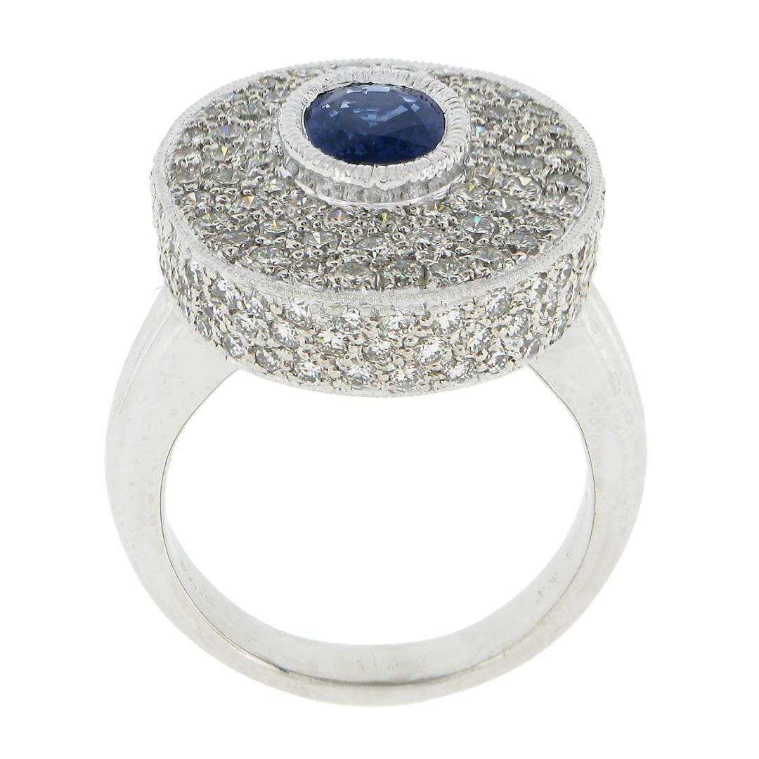 A solid paltinum platter ring, featuring 1 oval cut natural sapphire (1.74ct), and 159 round brilliant cut natrual diamonds ( F/G - VS1/VS2 ; 2.78ctw). The ring is size 7.0, weighs a total of 15.97 grams, and measures 21.1mm wide.