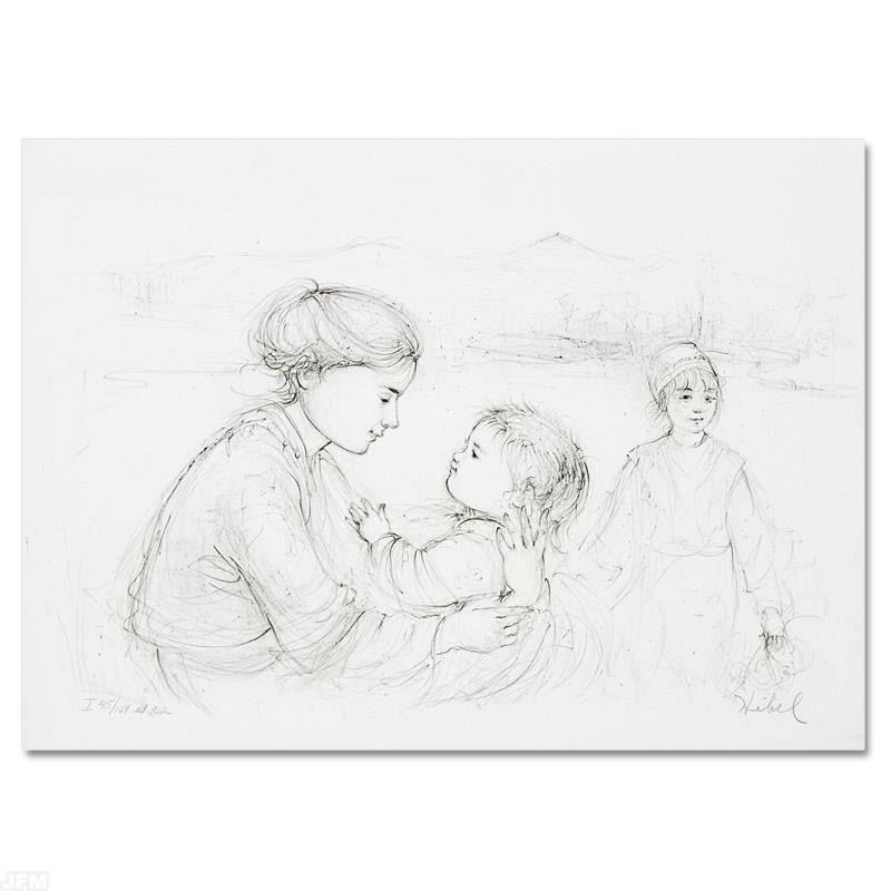 "Playful Mother and Baby" is a limited edition lithograph on paper, numbered and hand signed by Edna Hibel (1917-2014). Includes Certificate of Authenticity! Measures approx. 16" x 11.5" (with border), 16" x 9" (image).