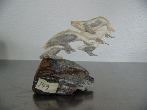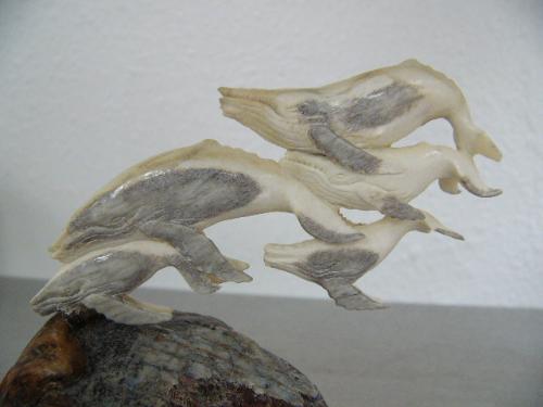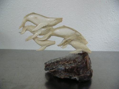Pod of 5 whales carved out of antler mounted on chunk of mammoth tooth- imported, not Alaskan ()