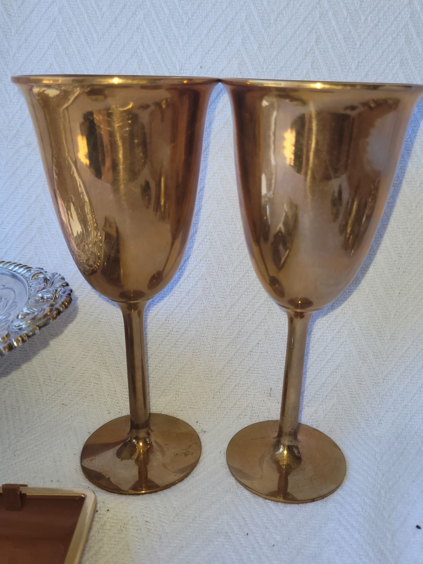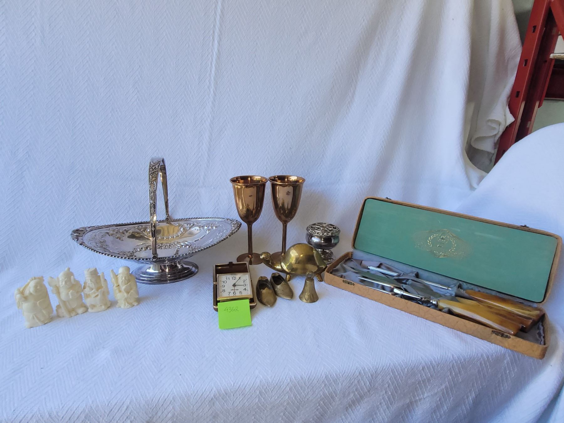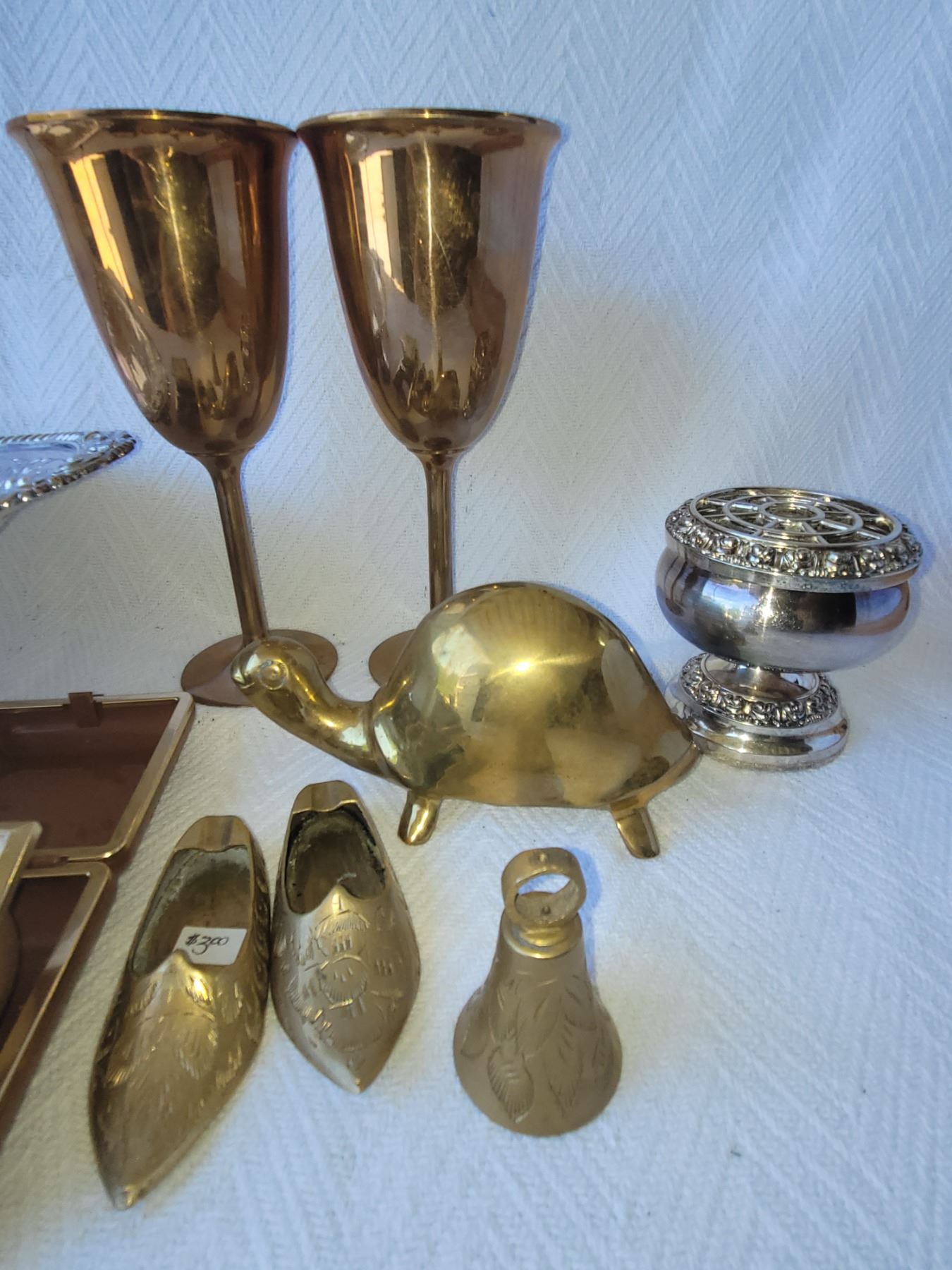 Metal goblets, brass tortoise, Connoiseurs Polished horn handled carving set and more. Pickup at 9 am