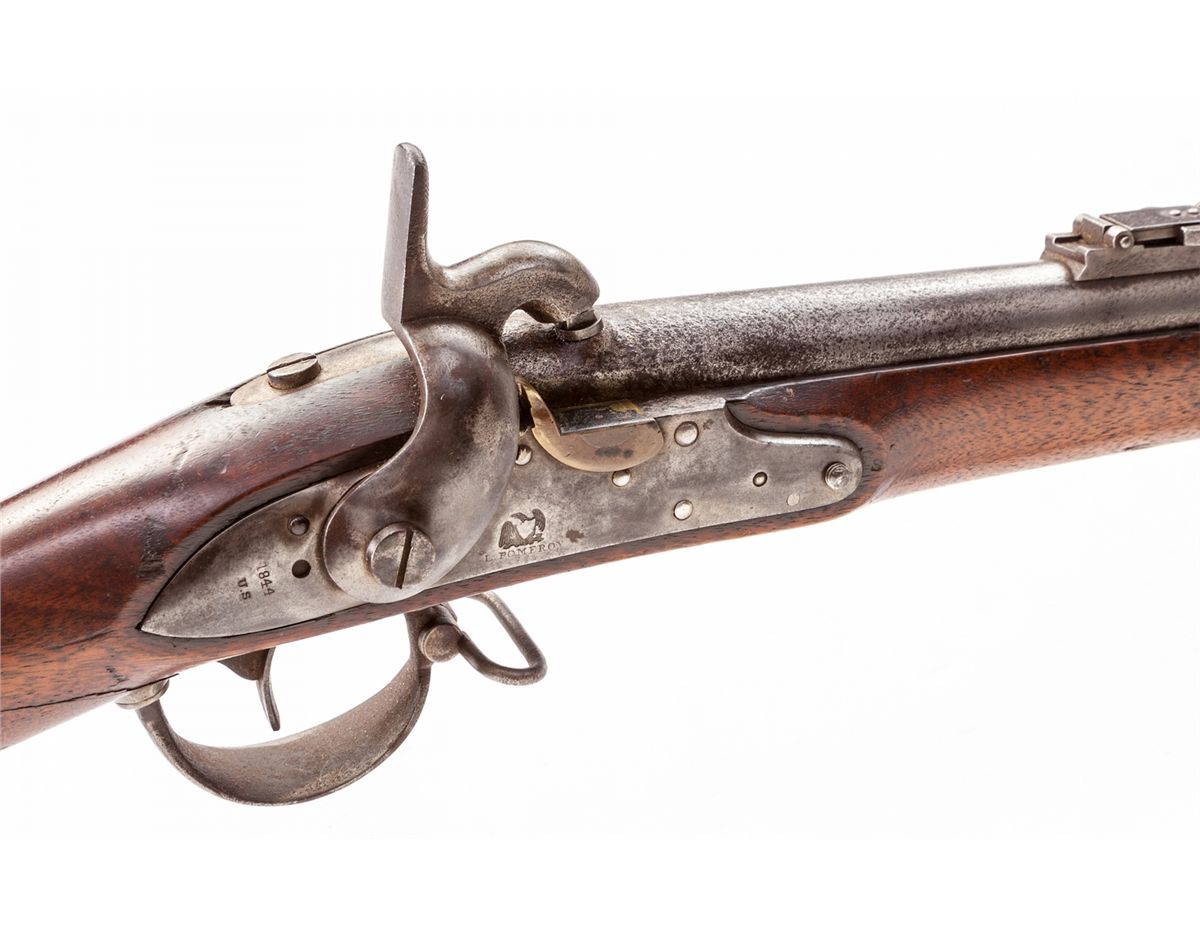 Percussion Conversion of Model 1840 U.S. Flintlock Musket, by L. Pomeroy, .69 cal., 42'' barrel, three iron bands, finished in the white, nicely cartouched walnut stock, with ramrod and long-range rear sight. Lockplate marked ''(eagle)/L. Pomeroy''; rear portion marked ''1844/U.S.''. Condition is very good with very light slightly cleaned corrosion to barrel, more pronounced in nipple area. Stock with crisp cartouches, minor scuffs, and oil staining, with facture emanating from right side trigger and terminating near comb (detracts little); stock shows no sanding. Action remains crisp, bore is good to very good with just light toning that should clean somewhat. Est.: $1,000-$1,500. (Antique)