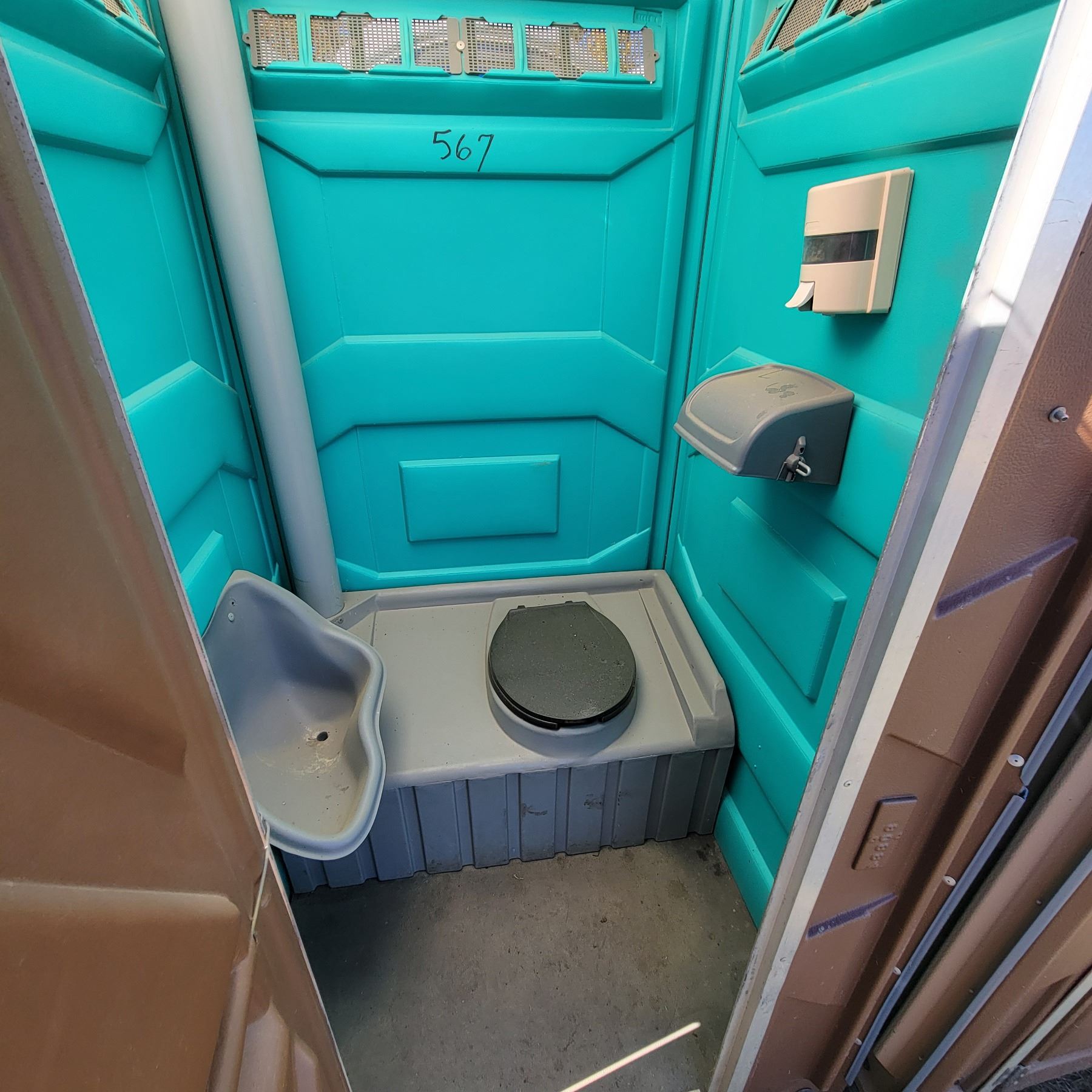 Porta Potty c/w hand sanitizer dispenser, urinal & TP dispenser