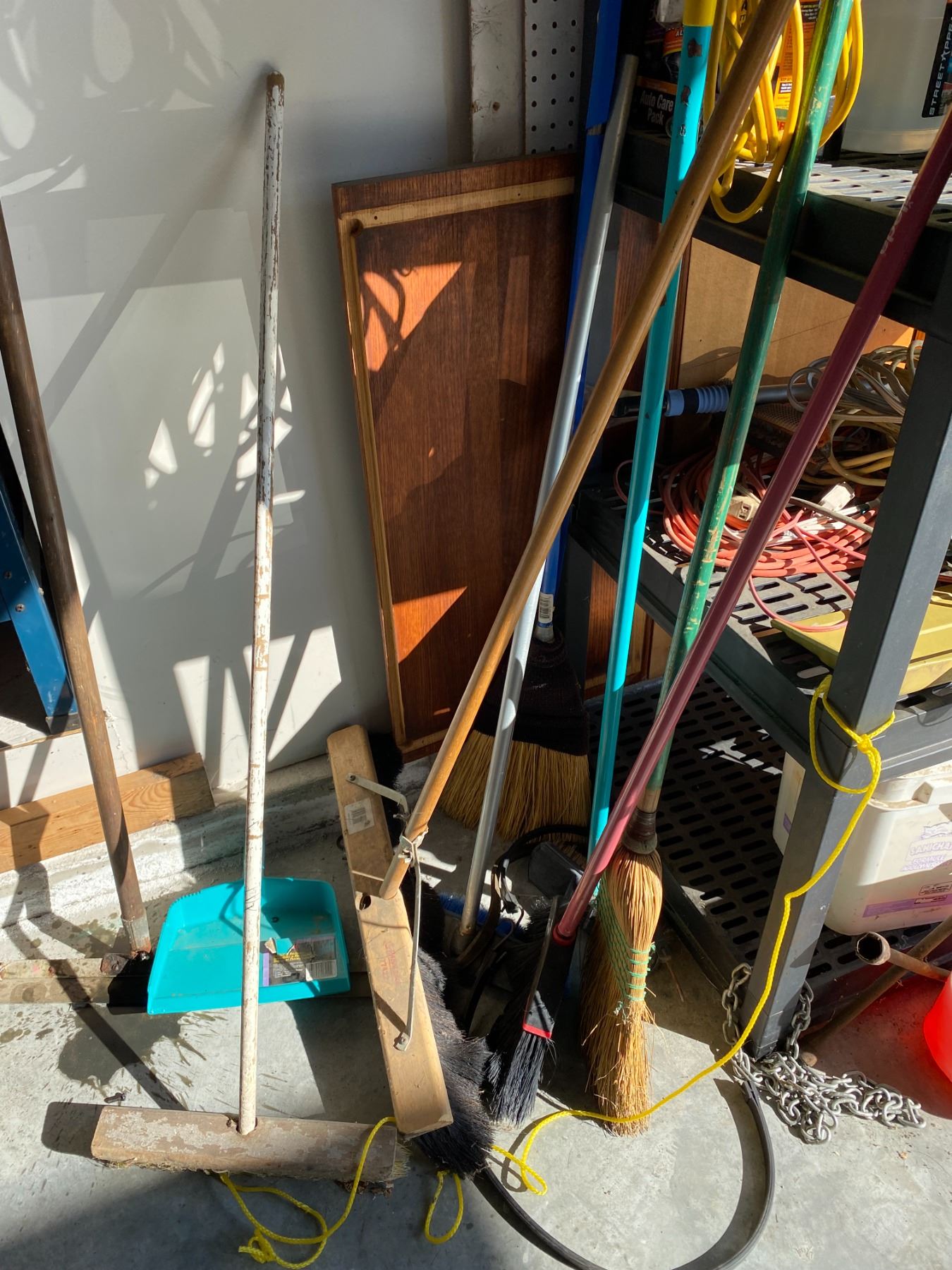 Portable shelving 36x24x77 includes contents and brooms to the left. Bring packing supplies and pickup at 9 am