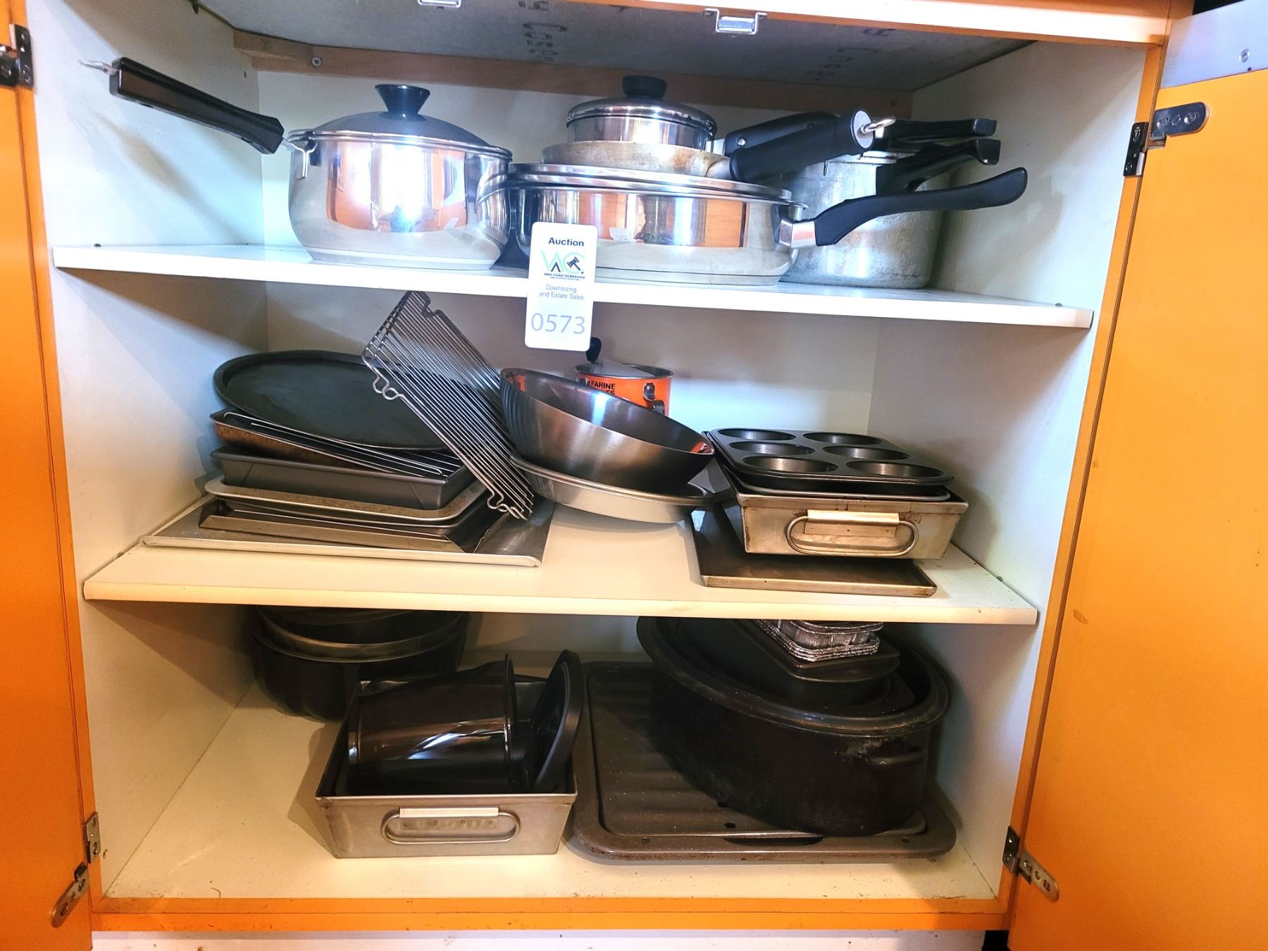 3 shelves of pots, pans, roaster, cookie sheets, cake pans and more. Pickup at 9 am