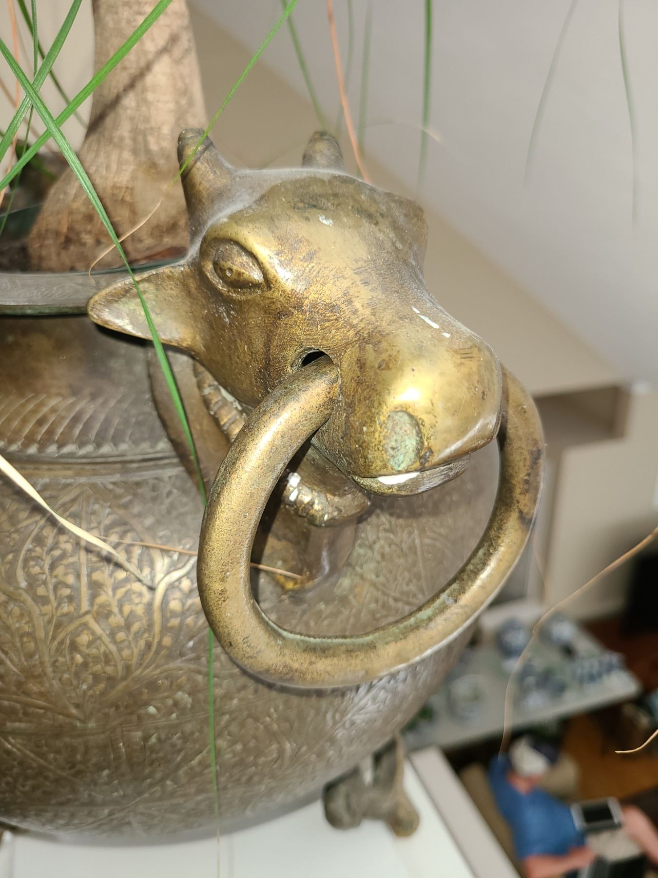 Potted plant in metal container featuring bull head handles. Pickup 10 am.