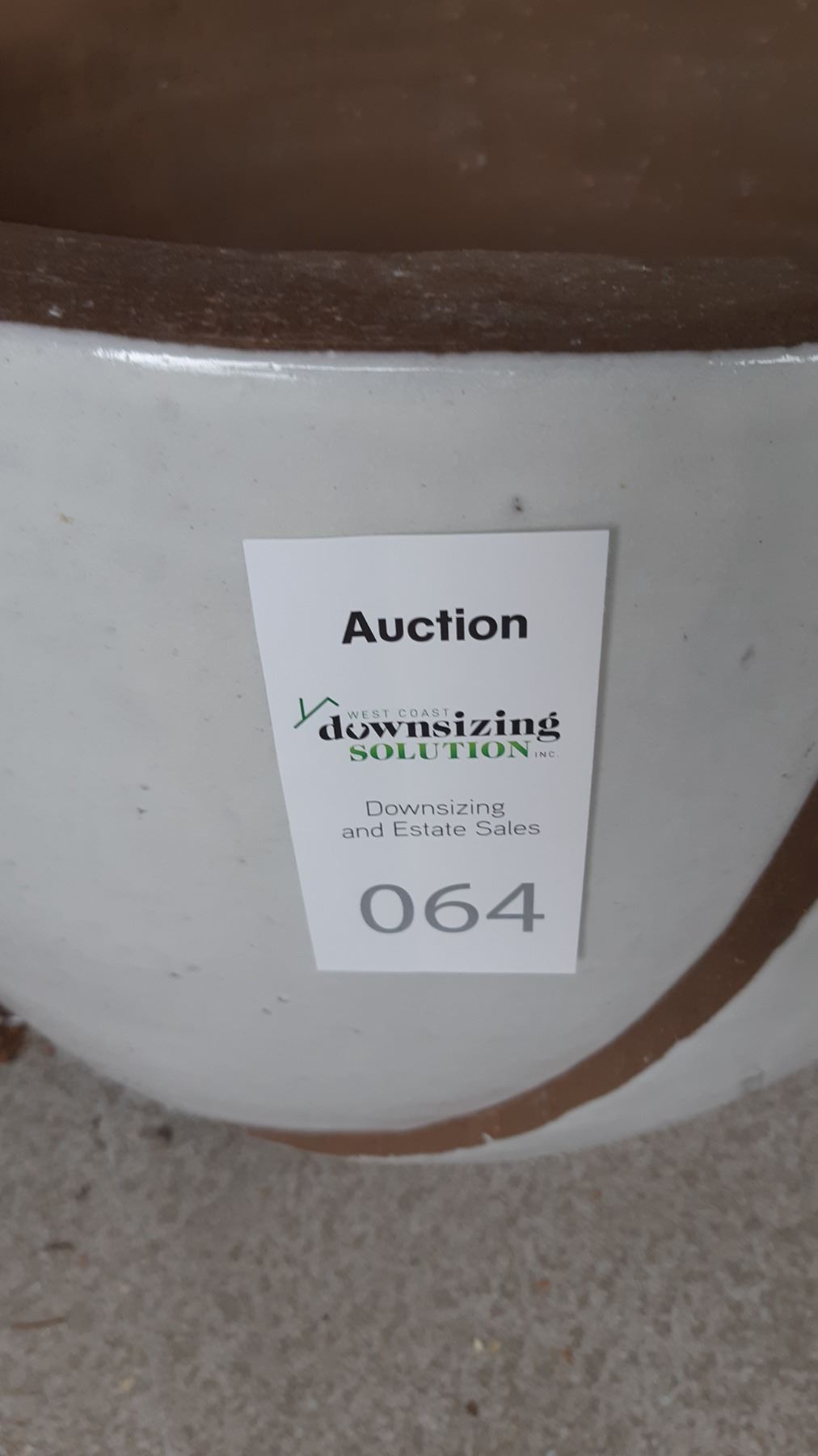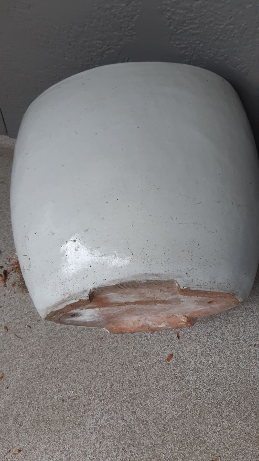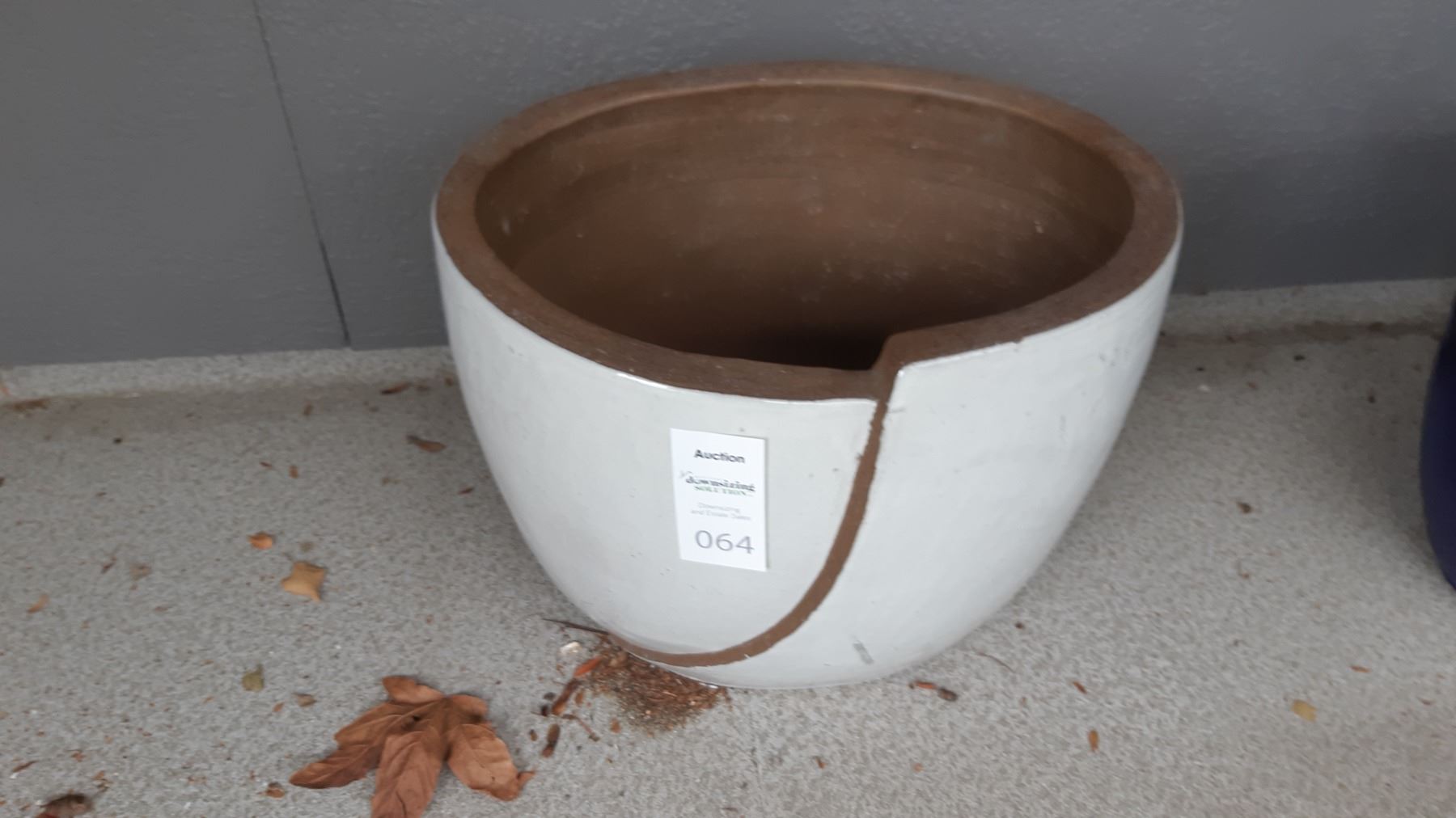 White and brown glazed planter is 18x14x15. Two drain holes on bottom. Some marks and wear from use.