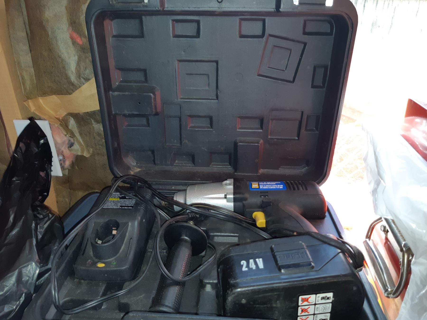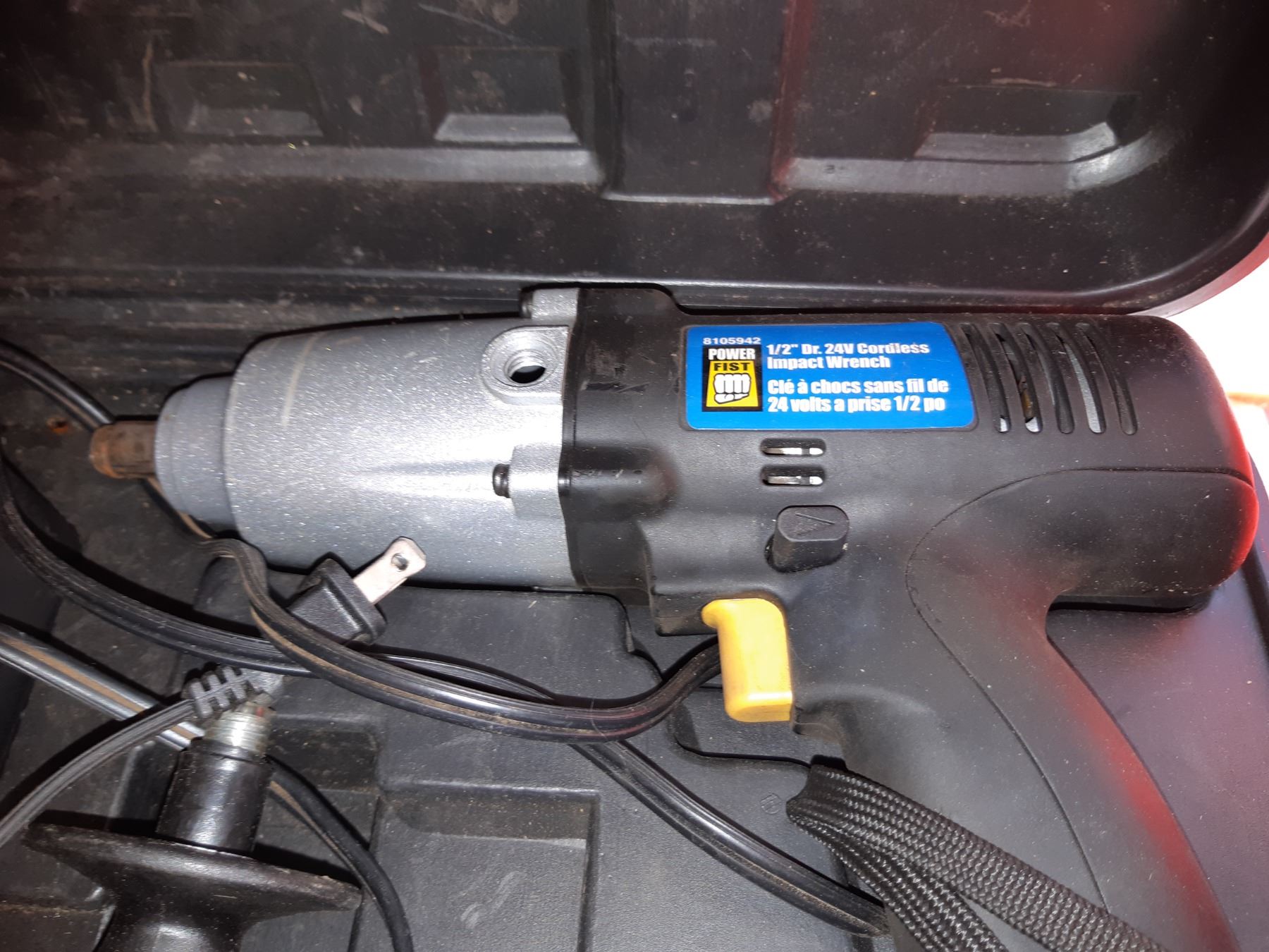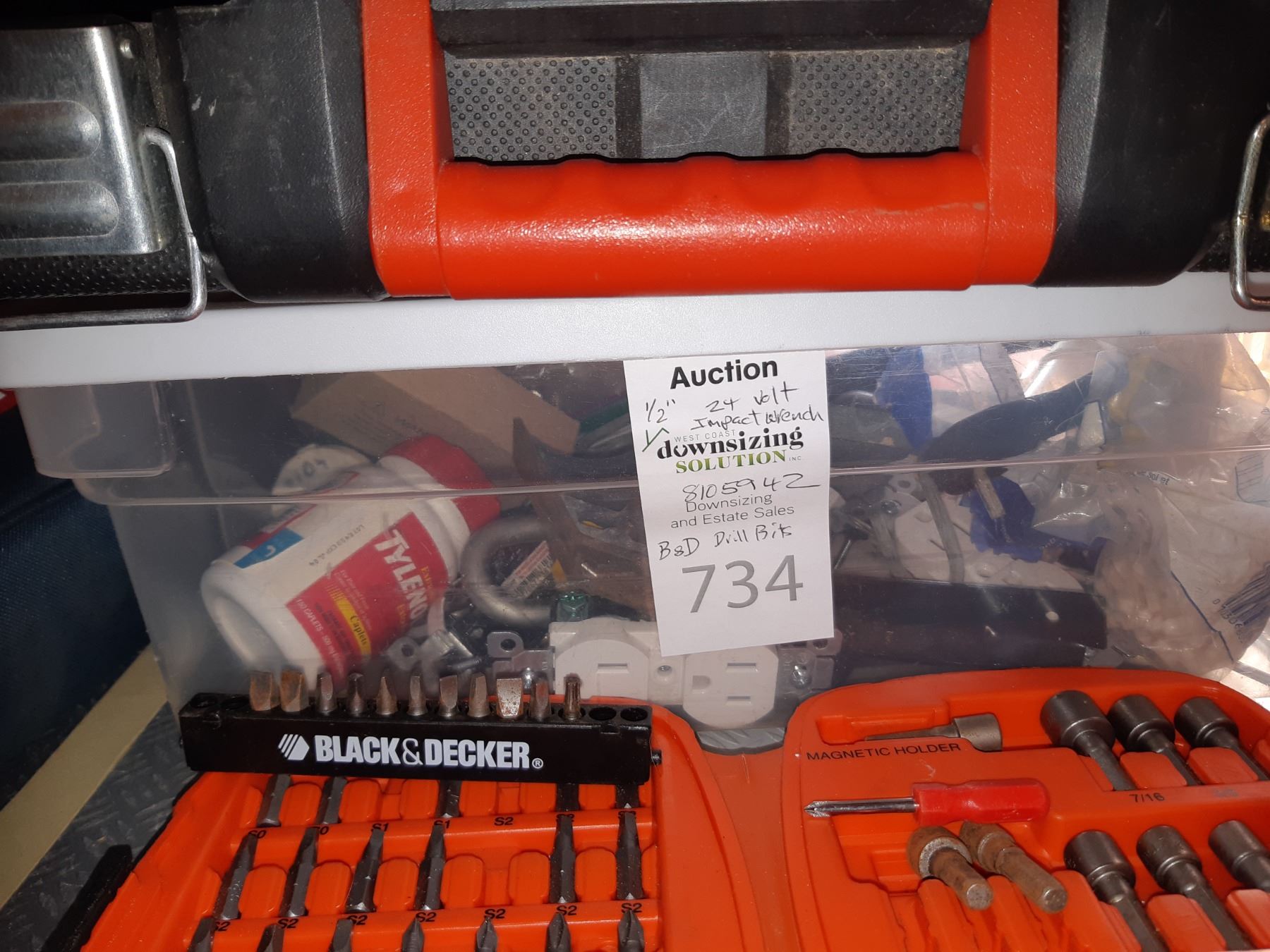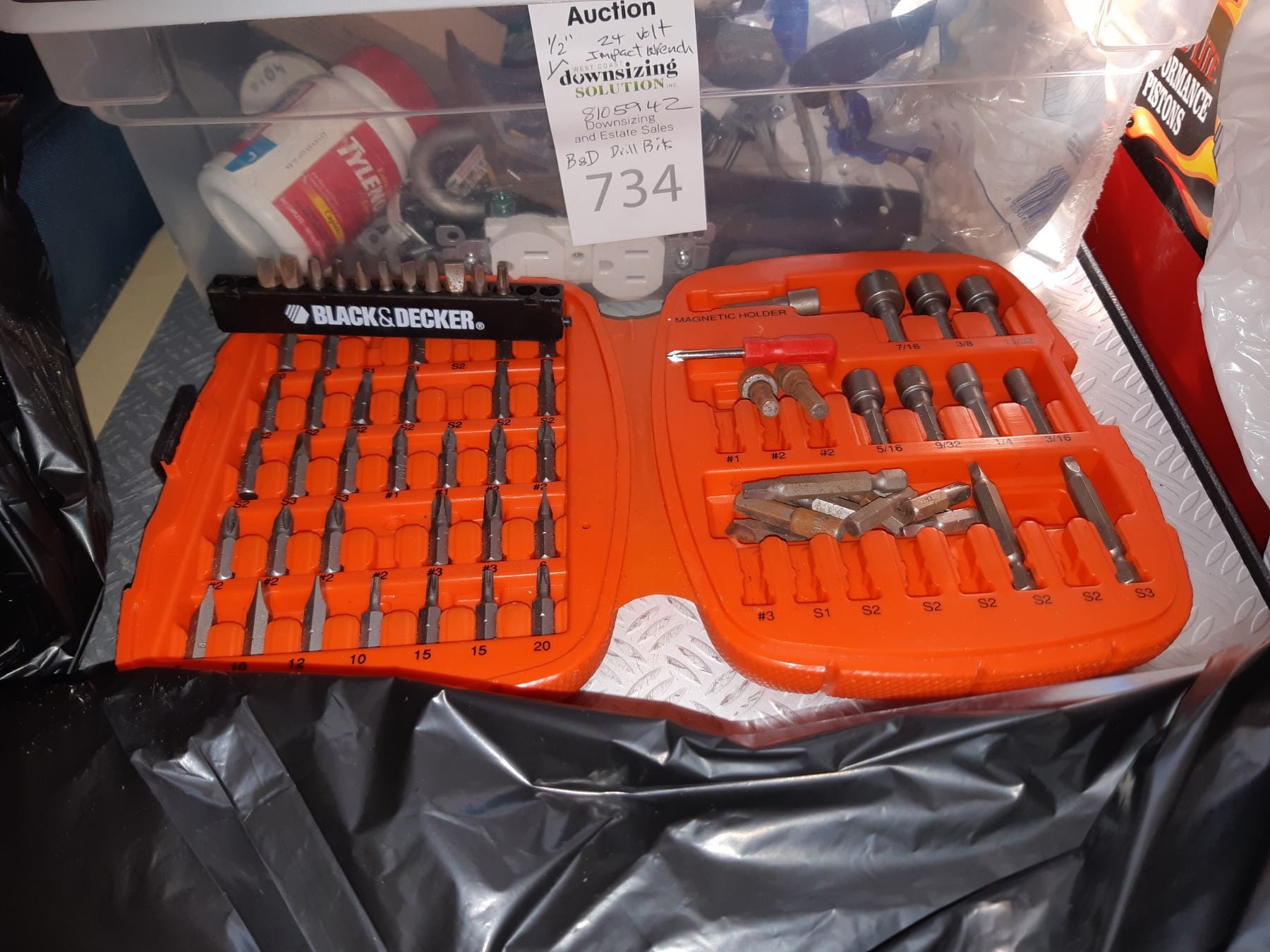 Power Fist 1/2” impact wrench in case, B&D drill bits, and small parts. Pickup at 9 - 11 am