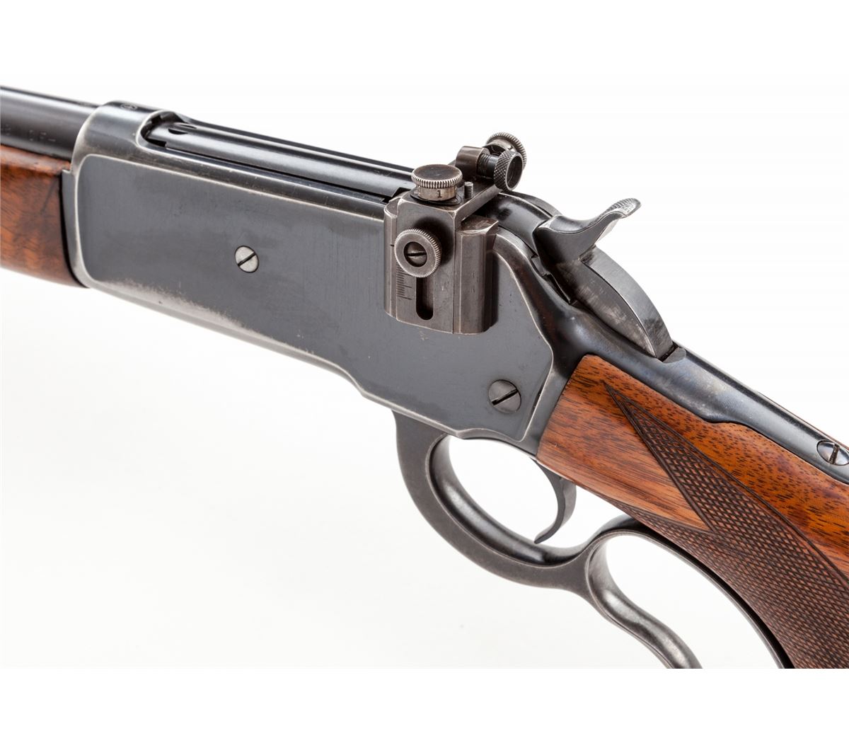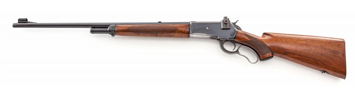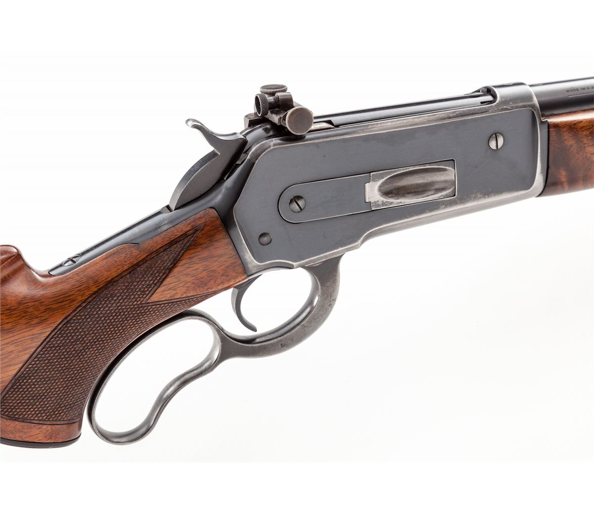 Pre-War Deluxe Winchester Model 71 Lever Action Rifle, #21766, .348 cal., 24'' barrel, blue finish, checkered pistol-grip walnut stock and forend, with standard front and Lyman rear peep sight. Mfg'd 1942. Condition is near excellent retaining approx. 92% original blue with thinning near muzzle, scuffs and scratches to forend cap, with smoothing and finish loss at balance point of frame. Stock shows light field use, minor flattening to checks, with thin fissure emanating from bottom frame area to forend. Action is crisp, bore is bright. Est.: $2,250-$3,000. (C&R)