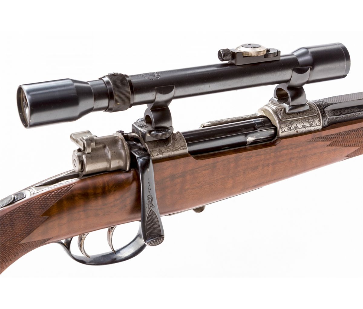 Pre-War German Mauser Sporting Rifle, #43276, 6.5x53 cal., 23'' part-round blue ribbed barrel, foliate engraved French gray frame and bolt head, spoon-handled bolt, double set triggers, medium relief game scene engraved magazine floorplate and trigger, fancy checkered full-length walnut stock with cheekpiece and horn forend tip. Topped with Ajack 4-power double claw-mounted scope with three-post reticle. Condition is excellent showing only light handling marks. Action is crisp, bore is bright, scope optics are clear. Est.: $3,500-$5,000. (C&R) (Ernest A. Bryant III estate)