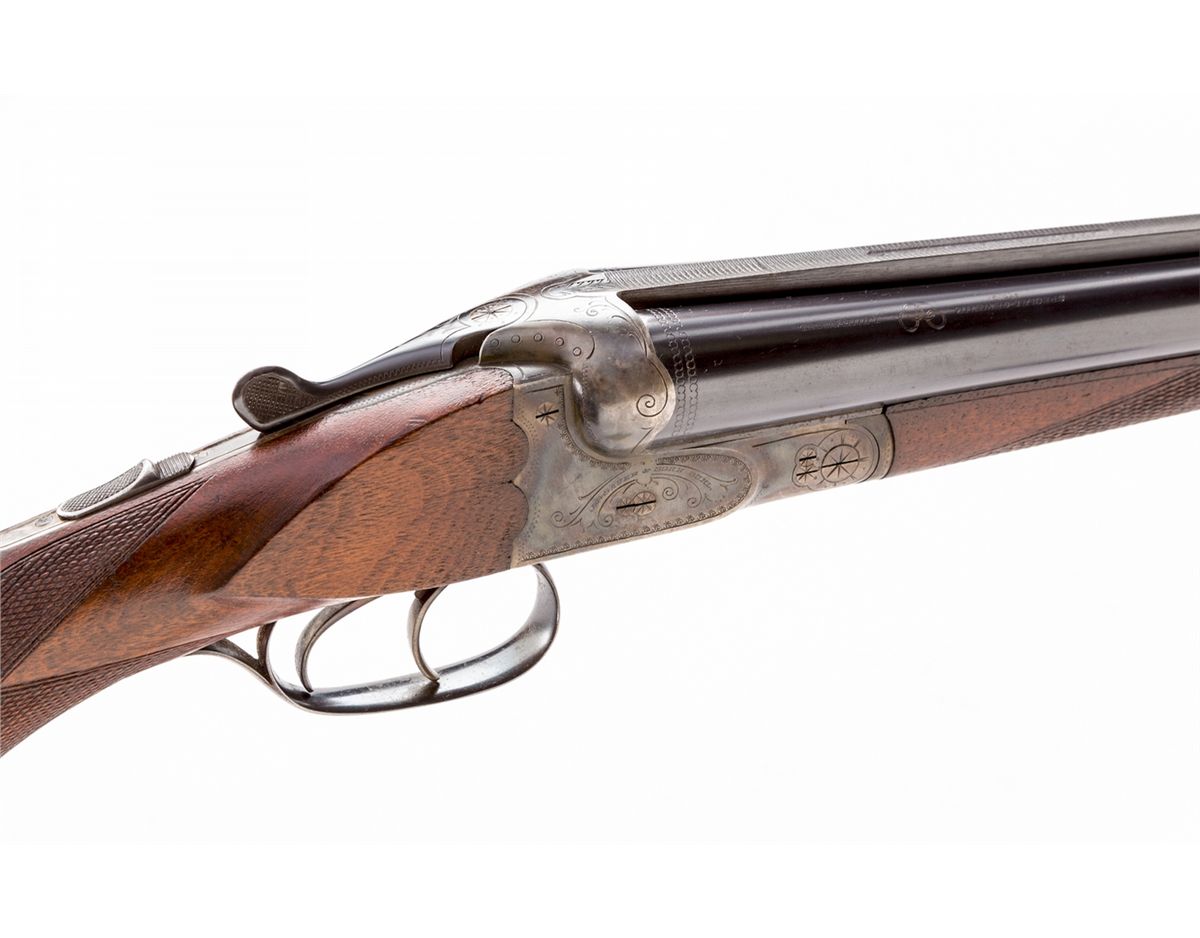 Pre-War J.P. Sauer & Sohn Side-by-Side Shotgun, #406273, 12 ga., 26'' high game rib barrels choked Full/Mod., marked ''Special-Gewehr/Lauf-Stahl'', with Olympic type ring motif; pistol-grip factory checkered walnut stock which has been professionally lengthened and splinter forend. Bottoms of barrels with crown-''U'', crown-''W'' and crown-''N'' nitro-proofs. Manual safety with ejectors, Greener type crossbolt, and single brass bead. Condition is excellent as lengthened, retaining approx. 98% blue to barrels, with similar amounts of case colors remaining to frame. Stock with minor scuffs and light pressure dings. Action is crisp, bores are mirror bright. Length of pull: 14-5/8''. Est.: $800-$1,200. (C&R) (Ernest A. Bryant III estate)