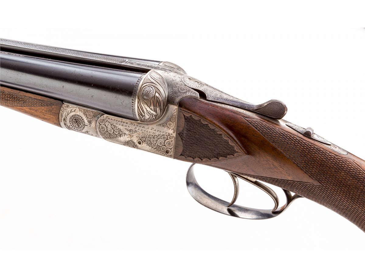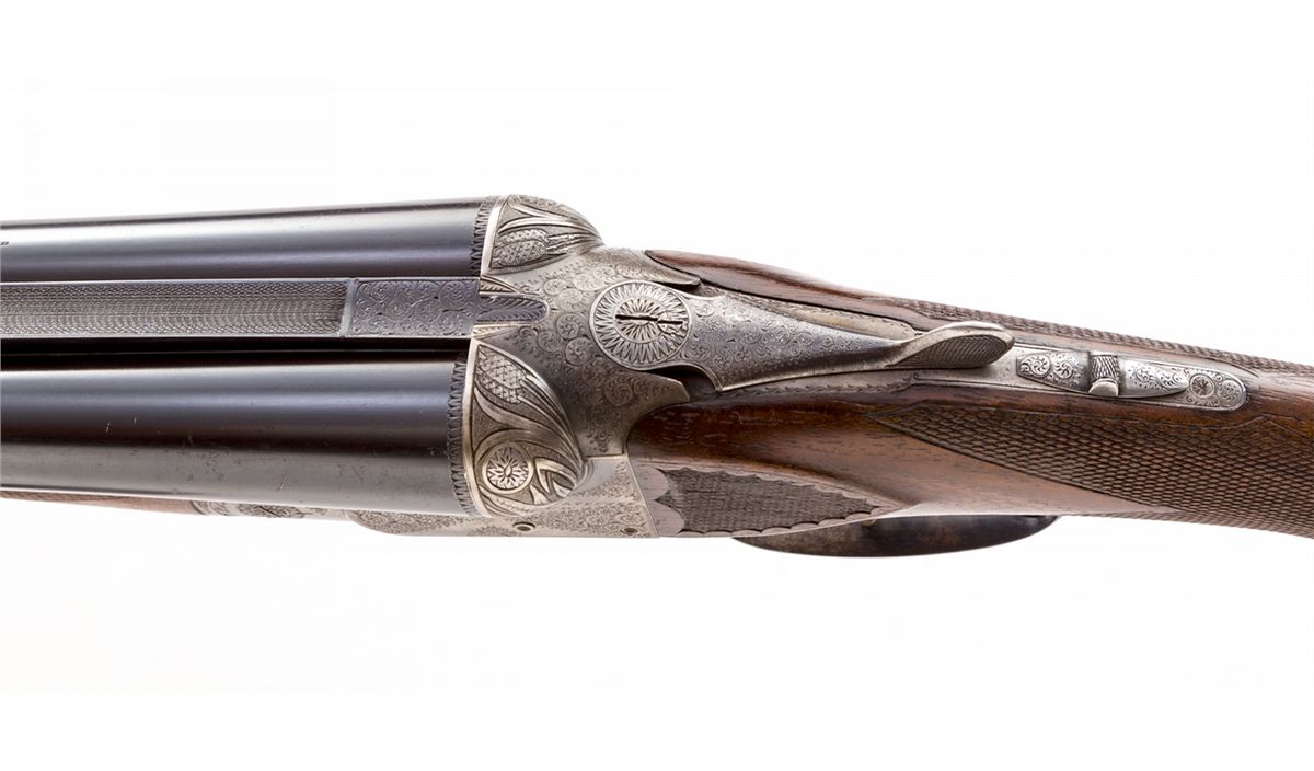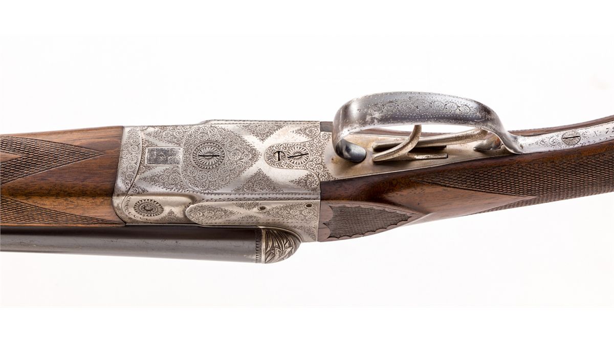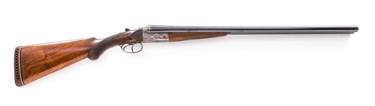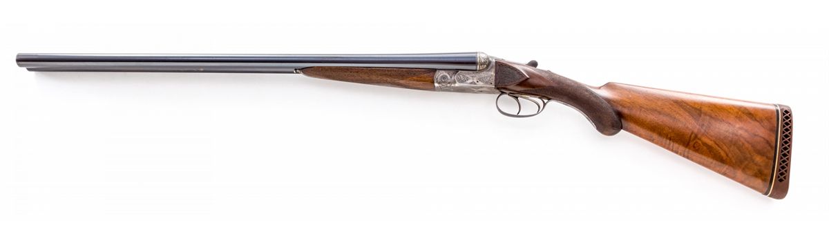 Pre-War VonLengerke & Detmold marked Boxlock Side-by-Side Shotgun, by Francotte, #72973, 12 ga., 26'' matte game rib blue barrels choked Mod./IC with white ivory sight block, tightly banknote and foliate engraved, case hardened boxlock frame, auto thumb safety with gold inlaid ''S'' to upper portion, double triggers, ejectors, Greener crossbolt safety, checkered Prince of Wales walnut stock and splinter forend, and later added Pachmayr brown rubber butt pad with black and white spacer. Condition is fine showing moderate field use, plugged area to top of rib where former central bead was located. Light micro-scratching to fine Belgian blue barrels. Approx. 65%+ remaining case colors to frame. Stock with moderate flattening to checks, very light scuffs, and micro-scratching from handling and field use. Action is crisp, bores are bright. Length of pull to end of wood: 13-15/16''; 14-11/16'' to end of pad. Est.: $1,800-$2,400. (C&R) (Ernest A. Bryant III estate)