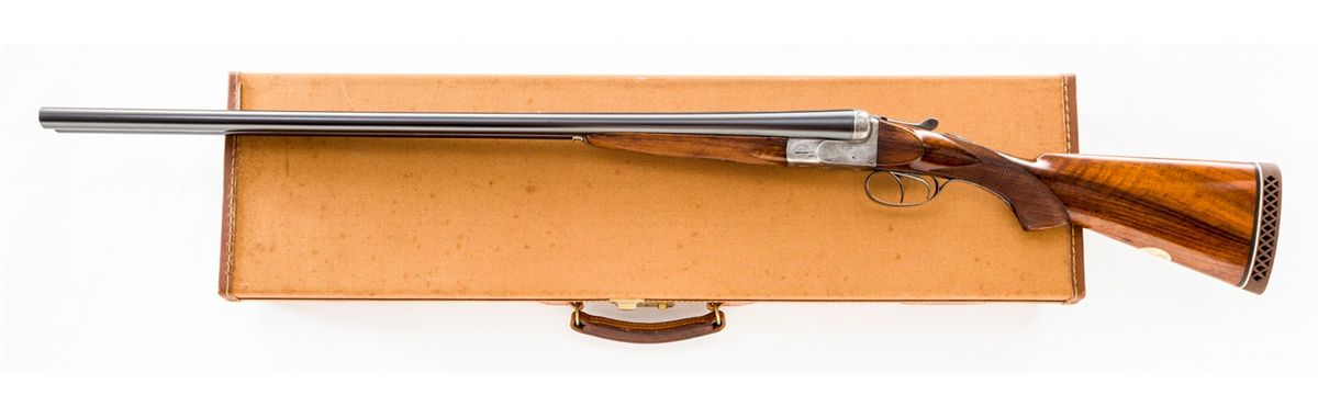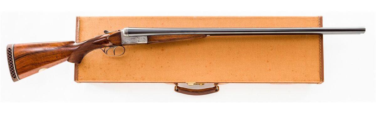Pre-War VonLengerke & Detmold marked Boxlock Side-by-Side Shotgun, by Francotte, #80360, 12 ga., 30'' matte game rib blue barrels choked Mod./IC with twin ivory beads, tightly banknote and foliate engraved, case hardened boxlock frame, auto thumb safety with gold inlaid ''S'' to upper portion, double triggers, ejectors, Greener crossbolt safety, checkered pistol-grip walnut stock and splinter forend, and later added Pachmayr brown rubber butt pad with black/white spacer. Gold ovoid plaque to bottom of stock with initials ''EWB''. In more modern Brady shotgun case. Condition is excellent. Barrels may have possibly been re-blackened at one point. Case colors have thinned and silvered. Checkering remains sharp; balance with additional coat of linseed oil. Action is crisp, bores are bright. Length of pull to end of wood: 12-7/8''; 13-7/8'' to end of pad. Est.: $1,800-$2,400. (C&R) (Ernest A. Bryant III estate)
