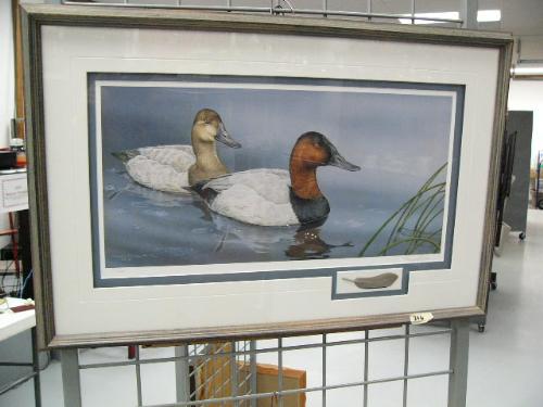 Print of "Canvasbacks - Rainy Day Cans" by Sherrie Russell Meline with hand cast and hand painted canvasback feather by Jerry Polan, double matted and framed(172)