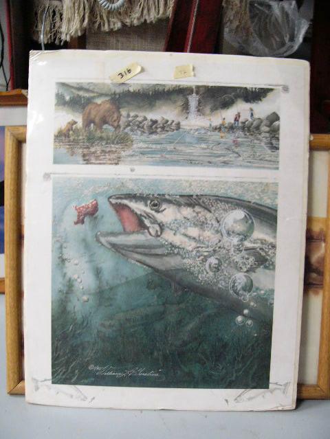 Print of fisherman catching salmon alongside stream with bears fishing by William L. Gorsline, number 29 of 50, backed by cardboard and shrinkwrapped(172)