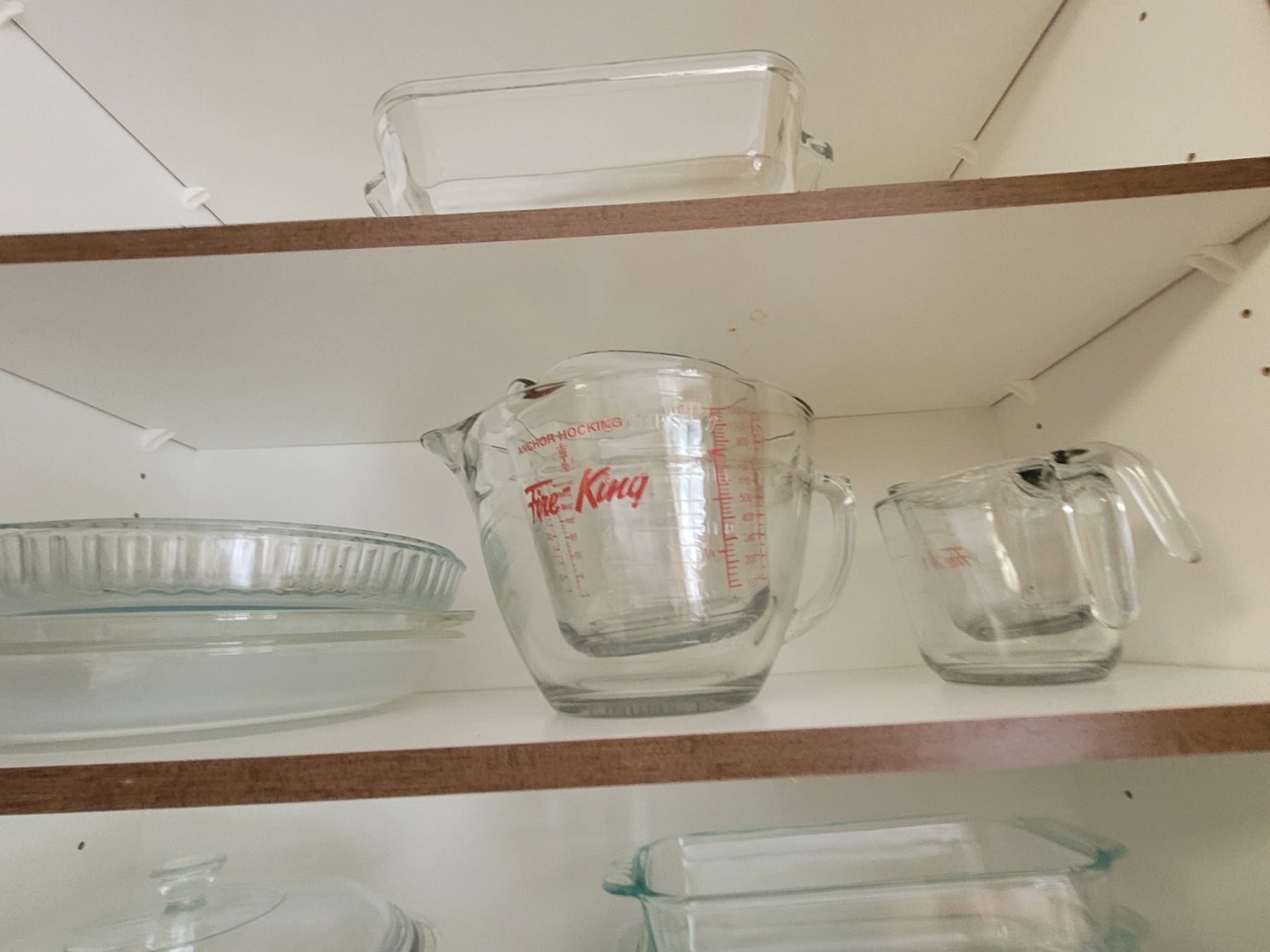 Contents of cupboard and counter. Measuring jugs, bakers, pie plates, stem ware and more.