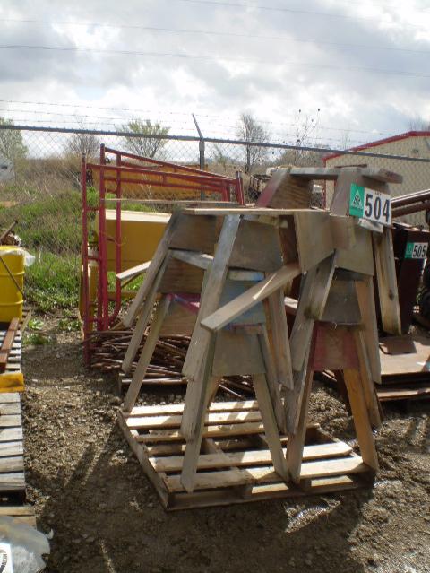 QUANTITY (4) PALLETS CONSISTING OF STRING LINE PINS & STRAIGHTENERS, (2) PCS. OF SCAFFOLDING, & WOODEN SAWHORSES