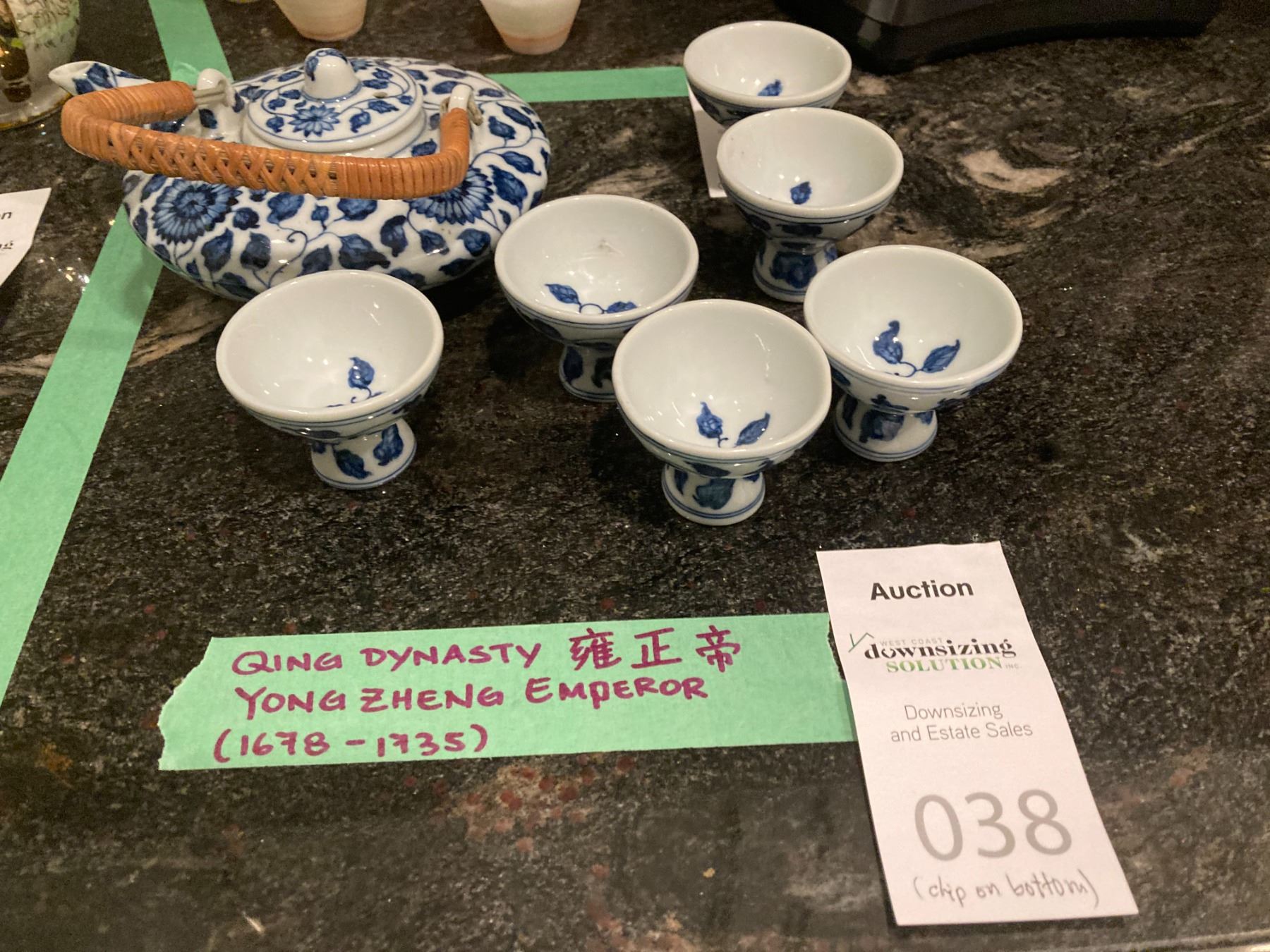 Yong Zheng Emperor (1678-1735) teapot with 5 cups. Please note small chip on bottom of 1 cup. Pickup at 9 am, cat. A.