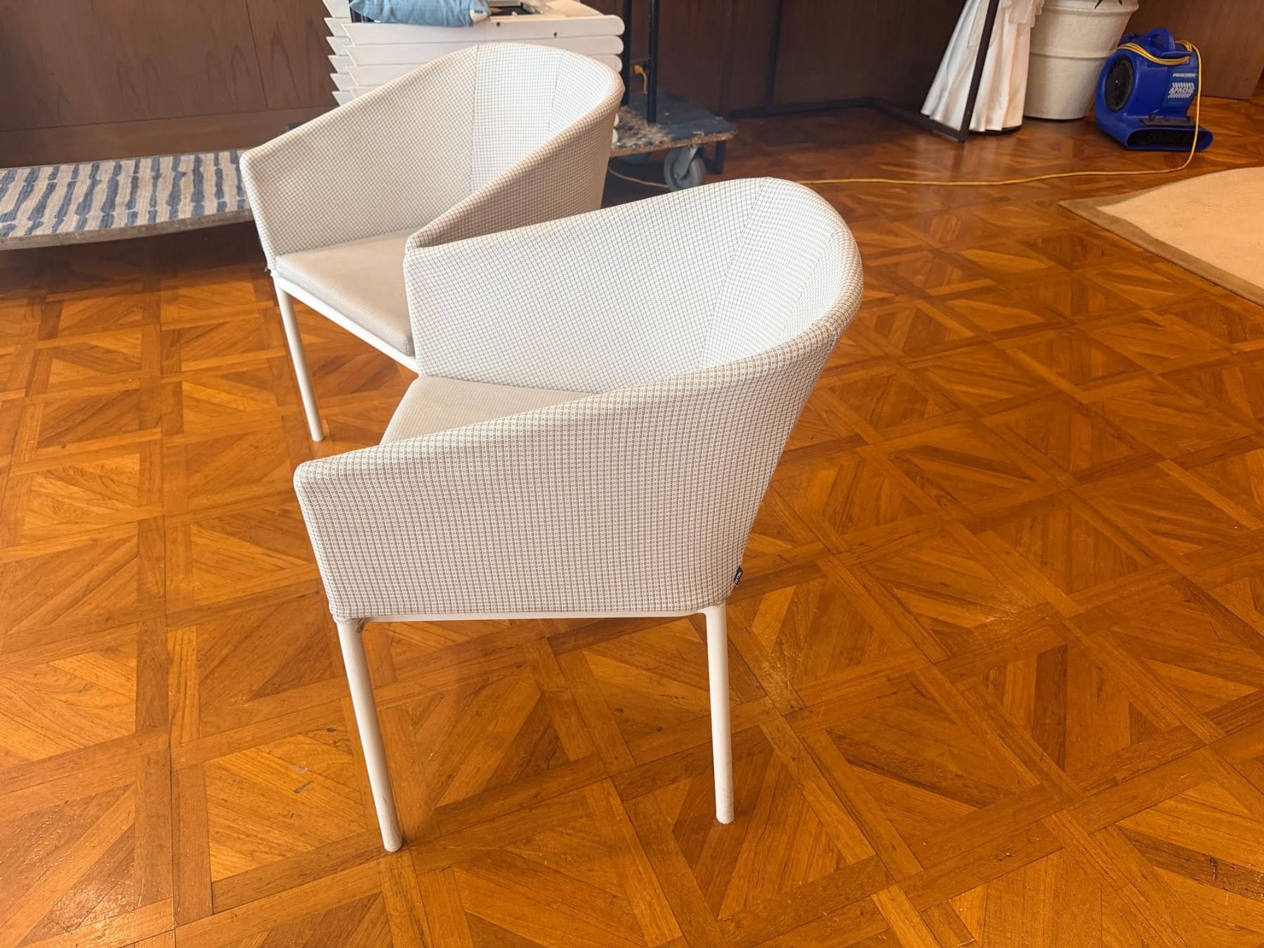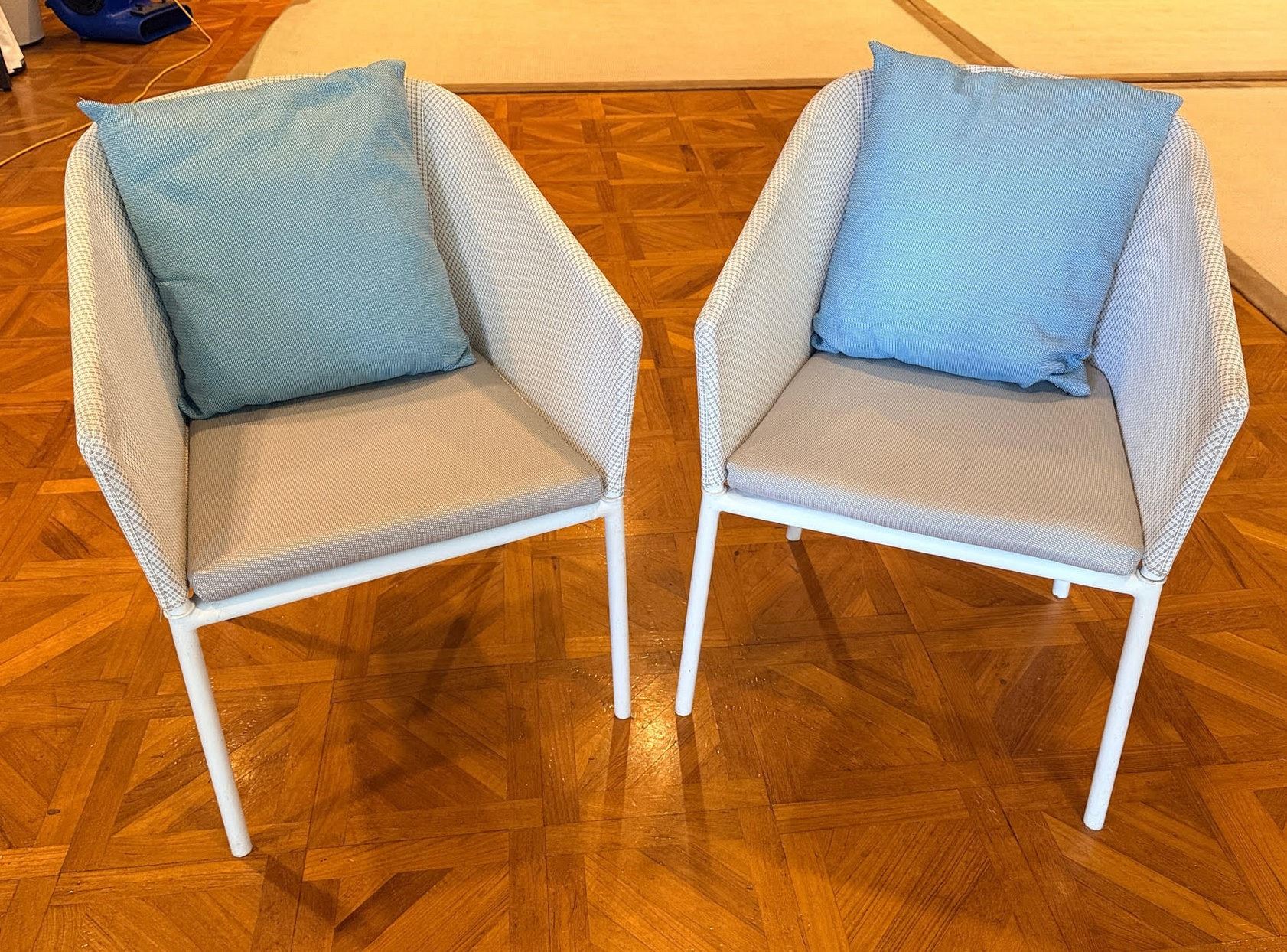 Listing photos are representative stock images. Actual chairs show signs of normal commercial use, including light surface wear and some discoloration or staining consistent with white outdoor furniture. Chairs were reported by the seller to have been cleaned, including cushions, and are considered usable. Condition will vary slightly from chair to chair. Seller reports that when originally purchased in 2021, chairs retailed for approximately $700 each, with cushions priced separately at approximately $100 per chair. Cushions feature a specialized outdoor venting design intended for outdoor use.