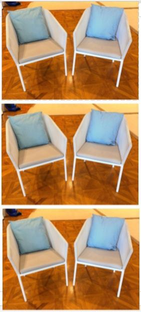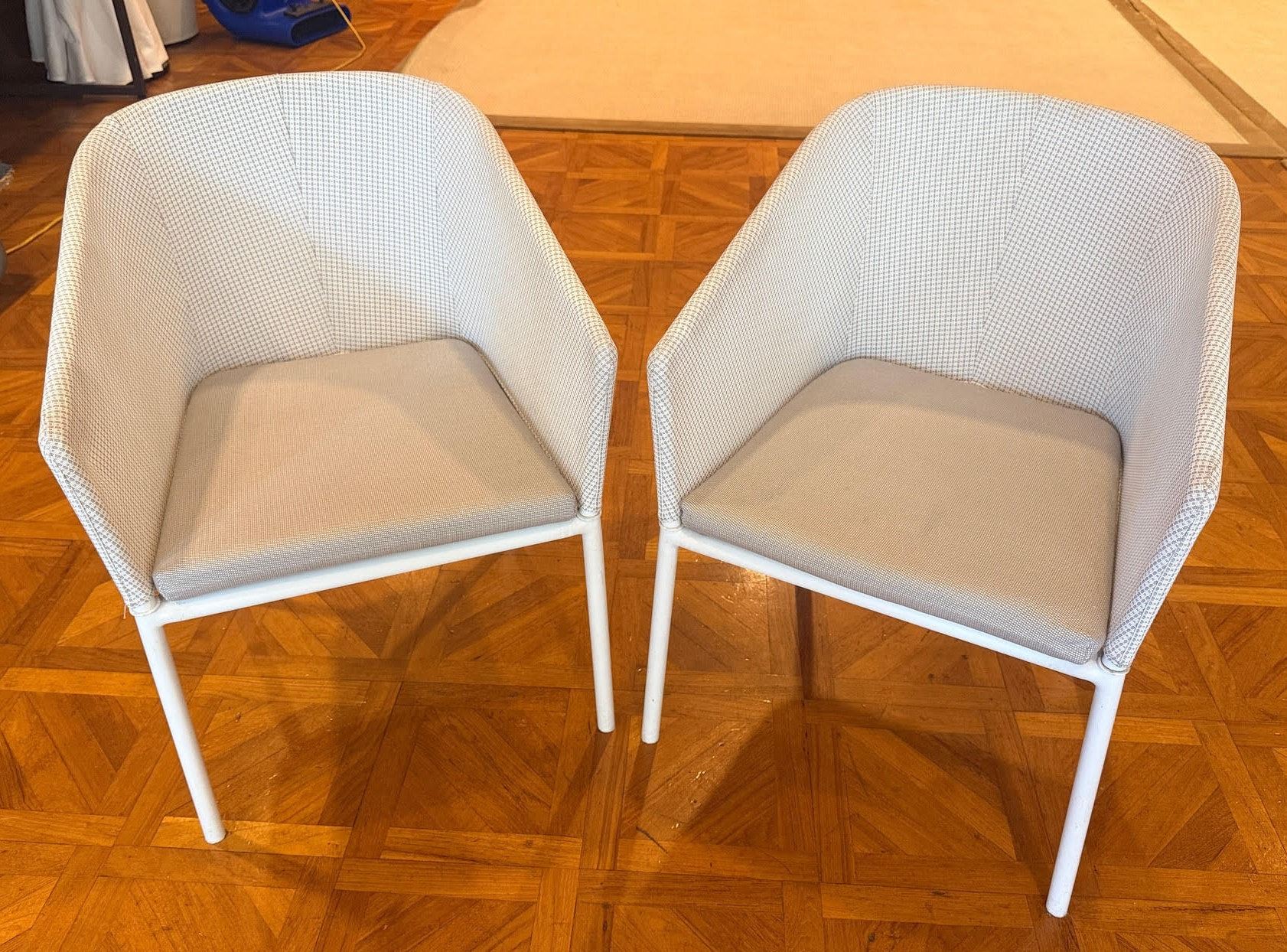 Listing photos are representative stock images. Actual chairs show signs of normal commercial use, including light surface wear and some discoloration or staining consistent with white outdoor furniture. Chairs were reported by the seller to have been cleaned, including cushions, and are considered usable. Condition will vary slightly from chair to chair. Seller reports that when originally purchased in 2021, chairs retailed for approximately $700 each, with cushions priced separately at approximately $100 per chair. Cushions feature a specialized outdoor venting design intended for outdoor use.