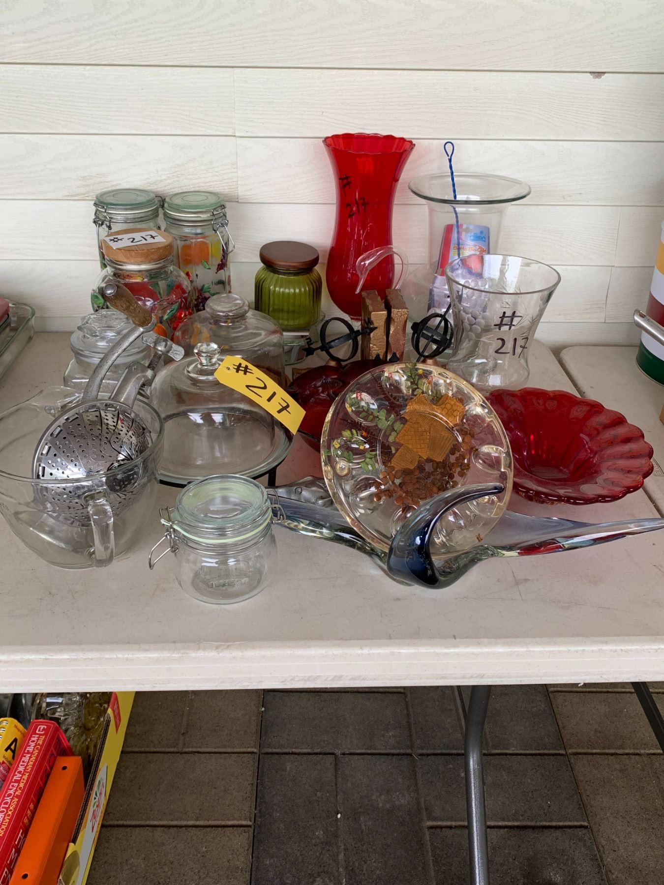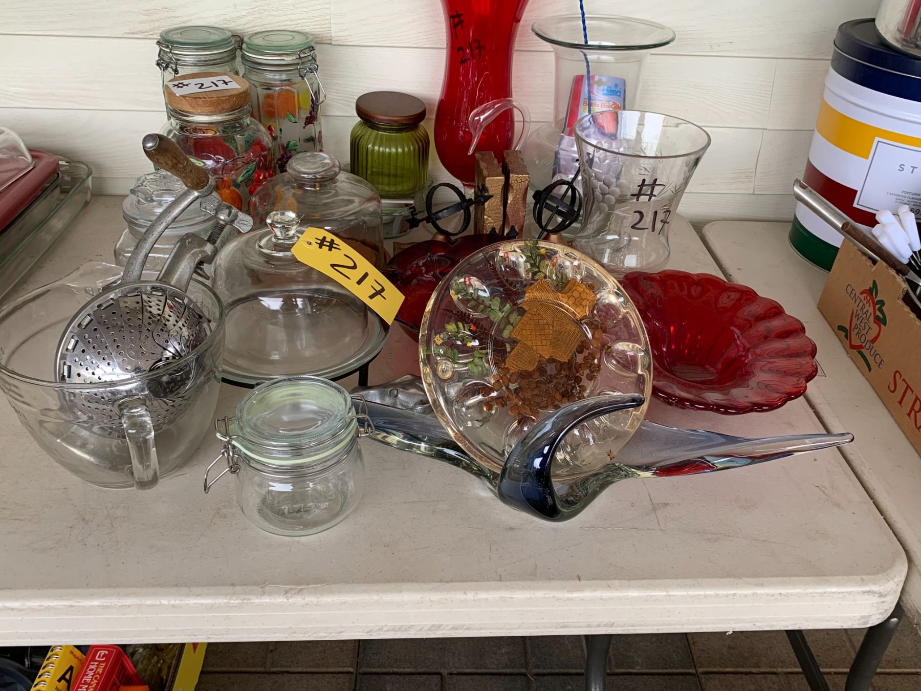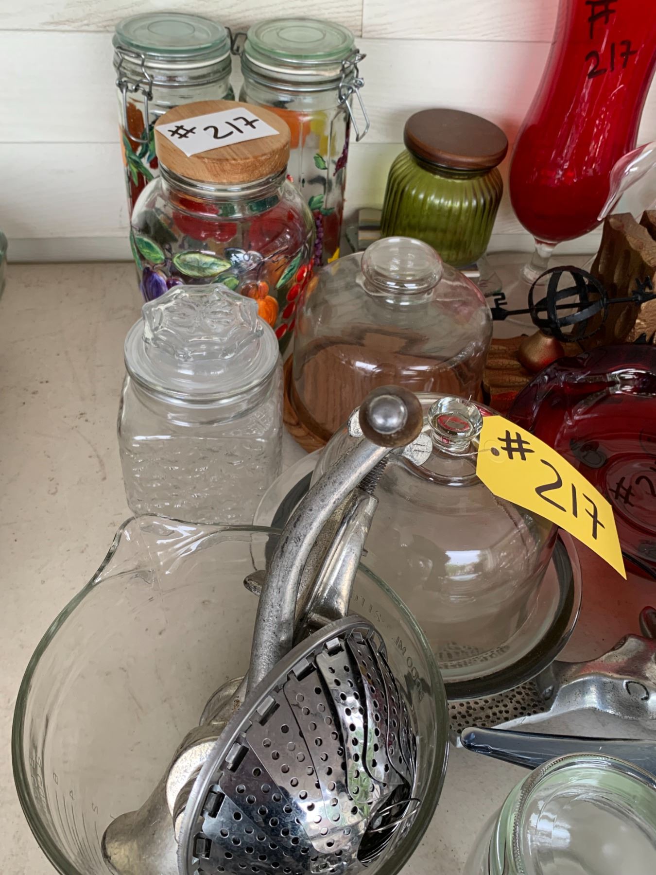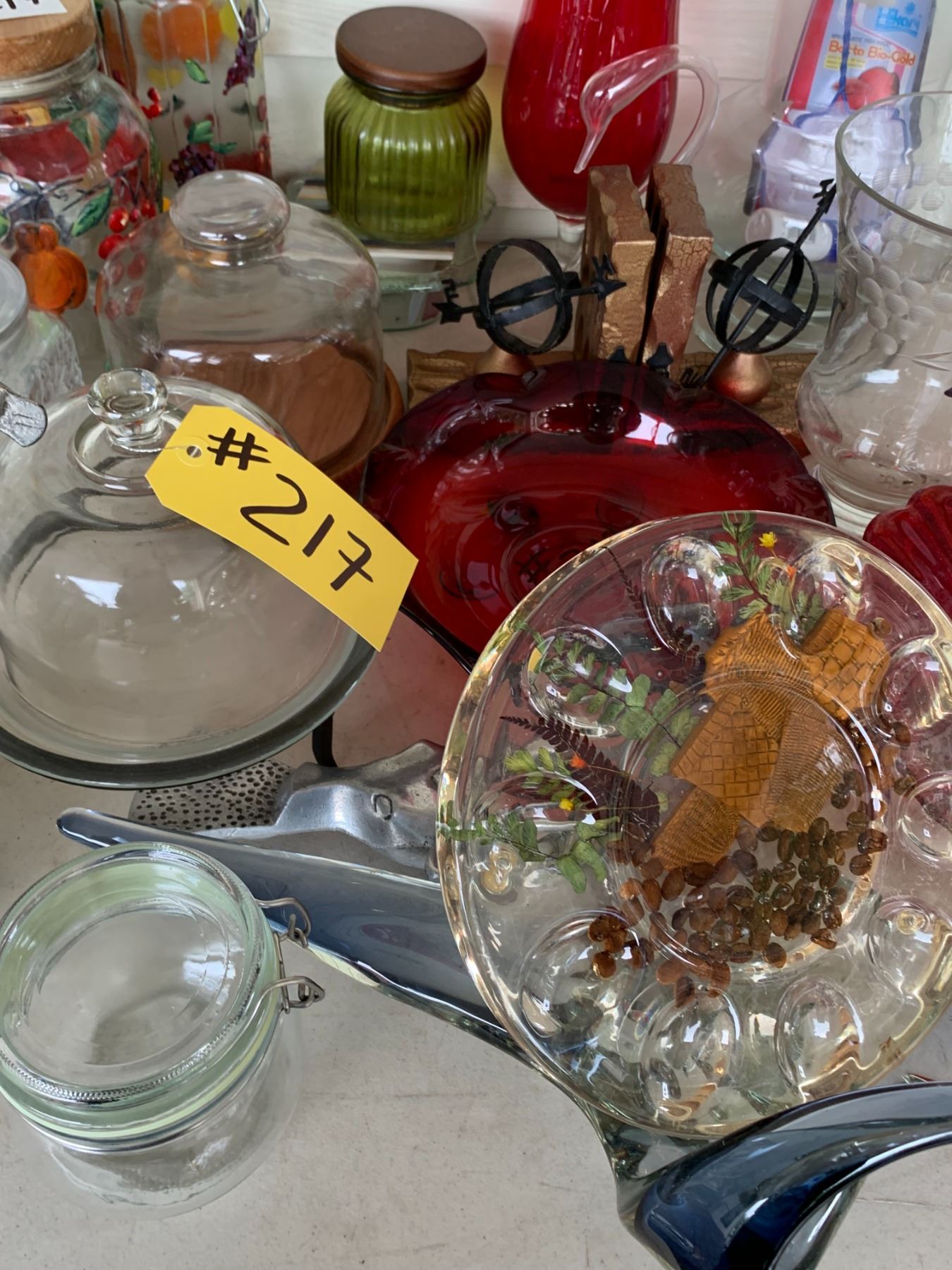 Qty of Glass jars, serving dish, glass vases, meat grinde, round cheese boards with glass dome cover