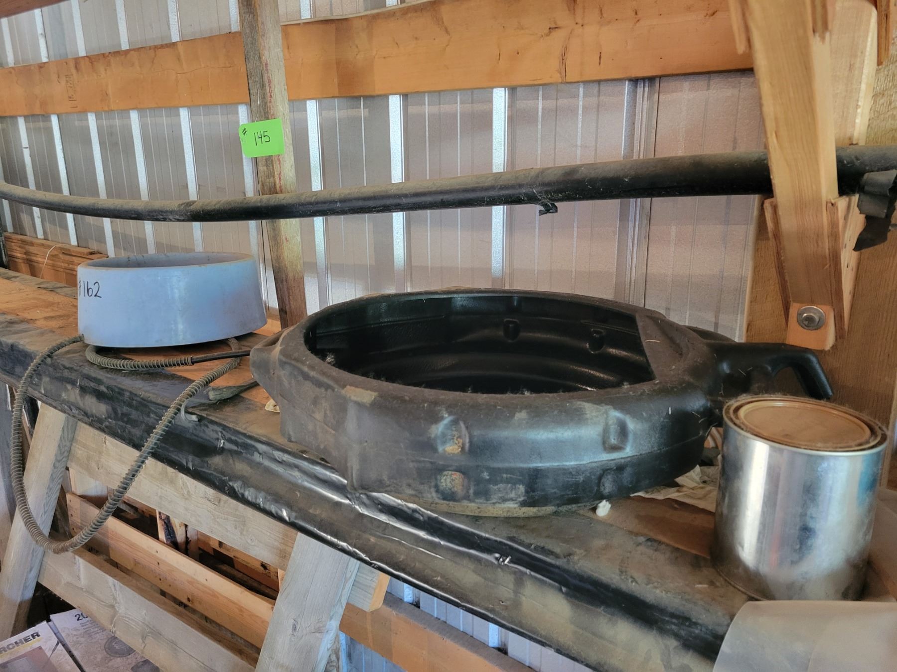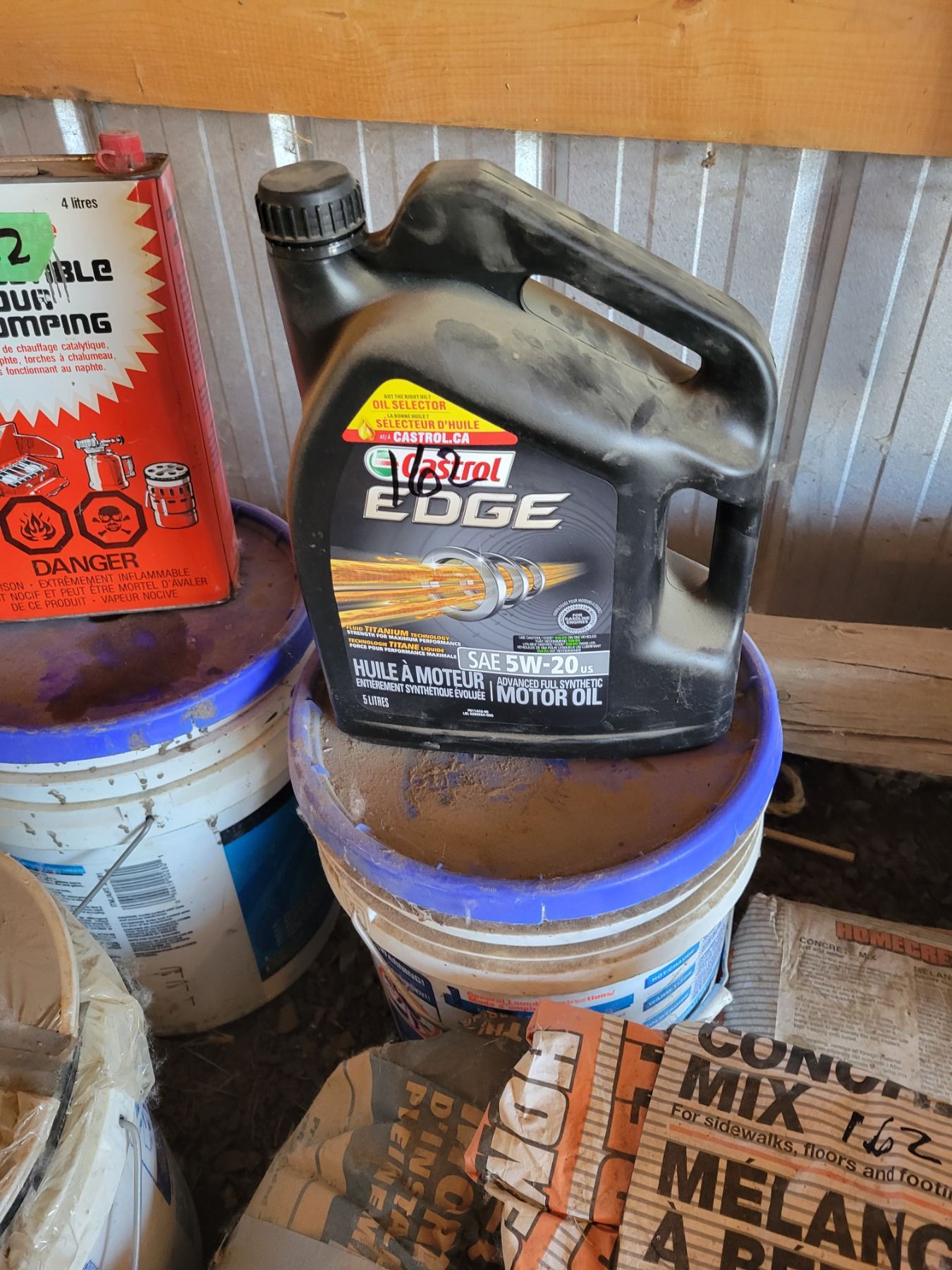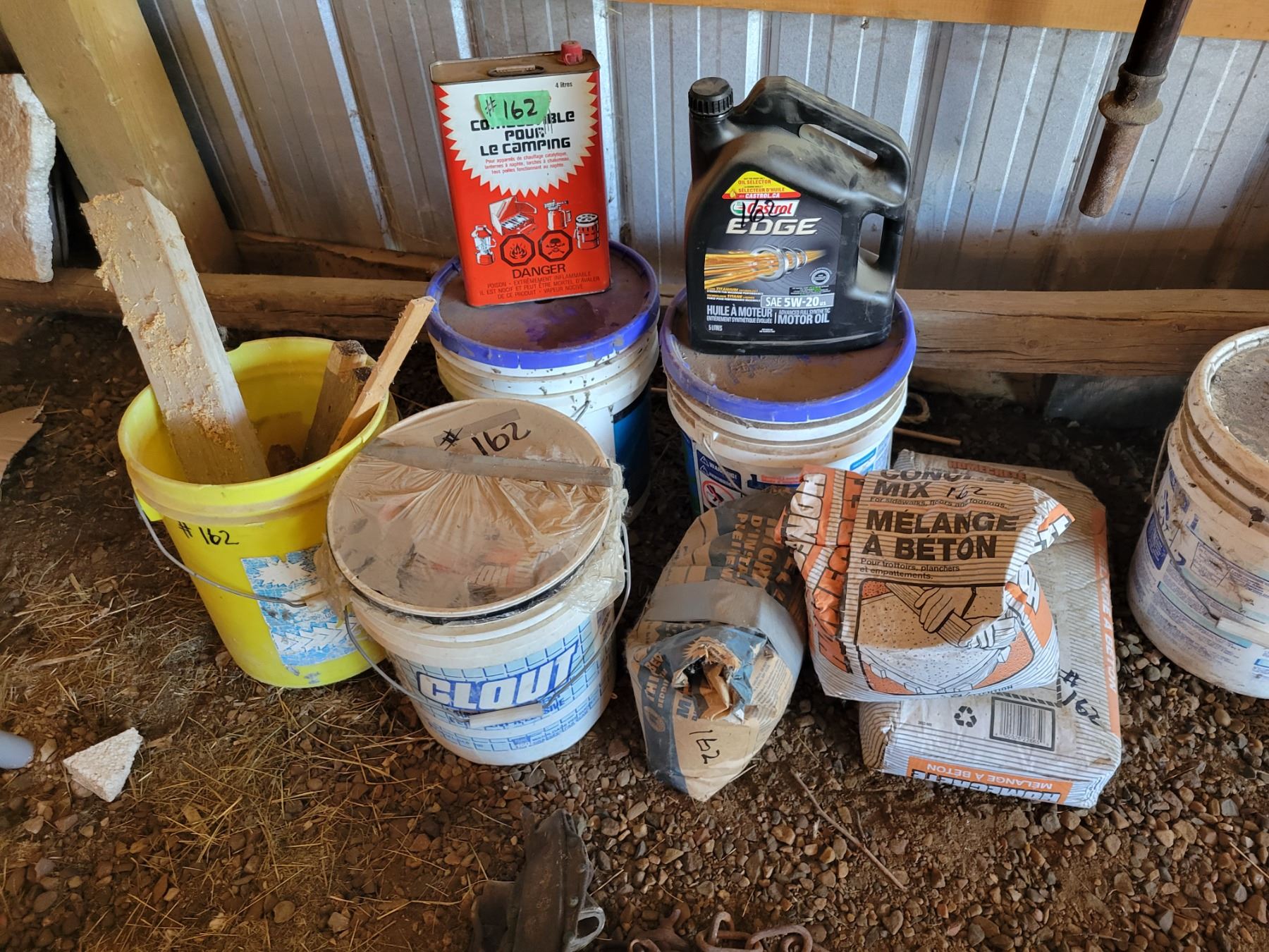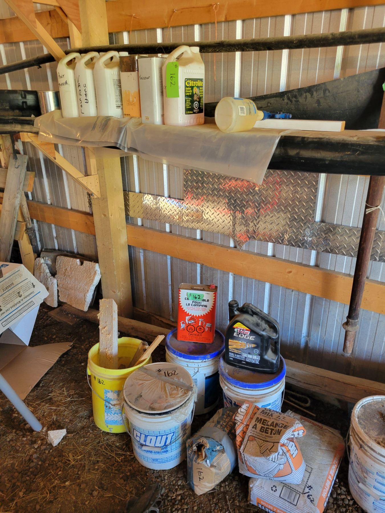 Qty of concrete parging mix, oils, varsols, thinners, oil pan & misc.