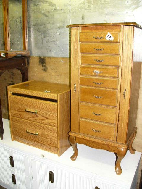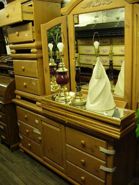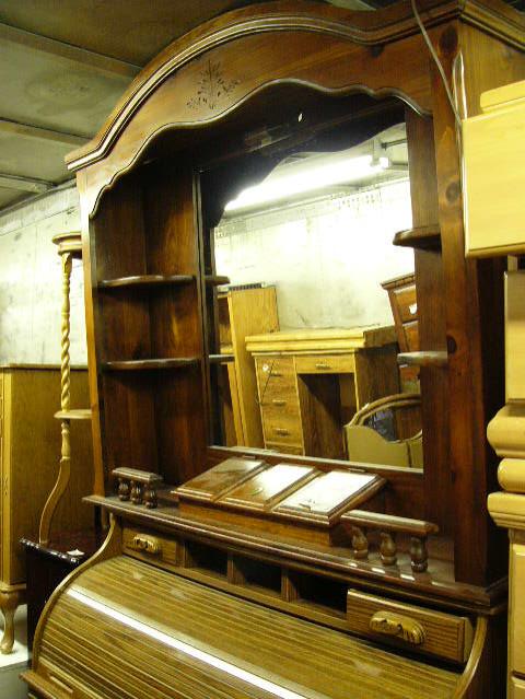 Queen sized bed; bookshelf; 2 jewelry boxes; roll top desk; 4-piece pine bedroom set (42)