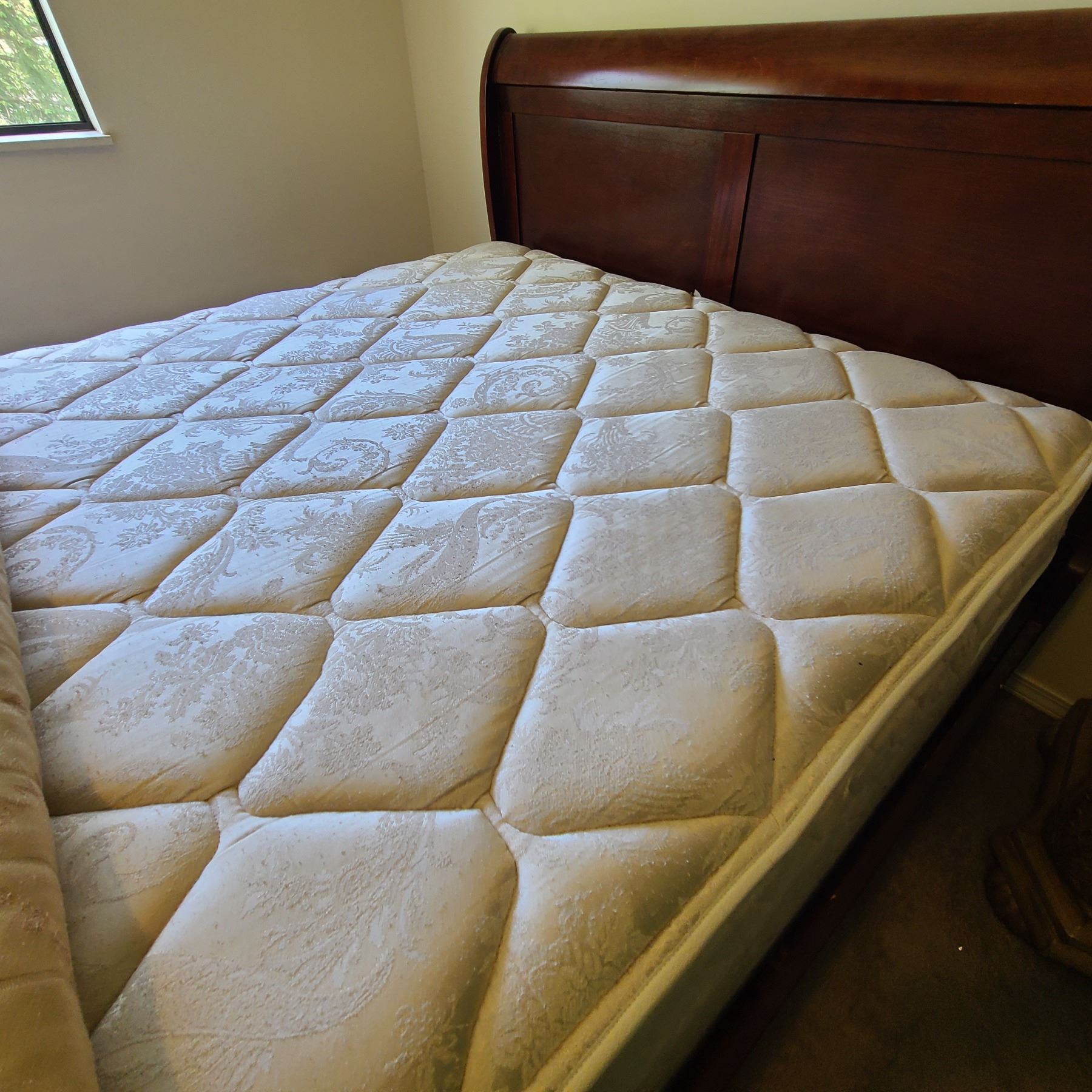 Headboard, footboard and side rails note scratches. Box spring and mattress optional. Mag Strong acupressure mattress topper. Bring tools to dismantle. Pickup at 11 am