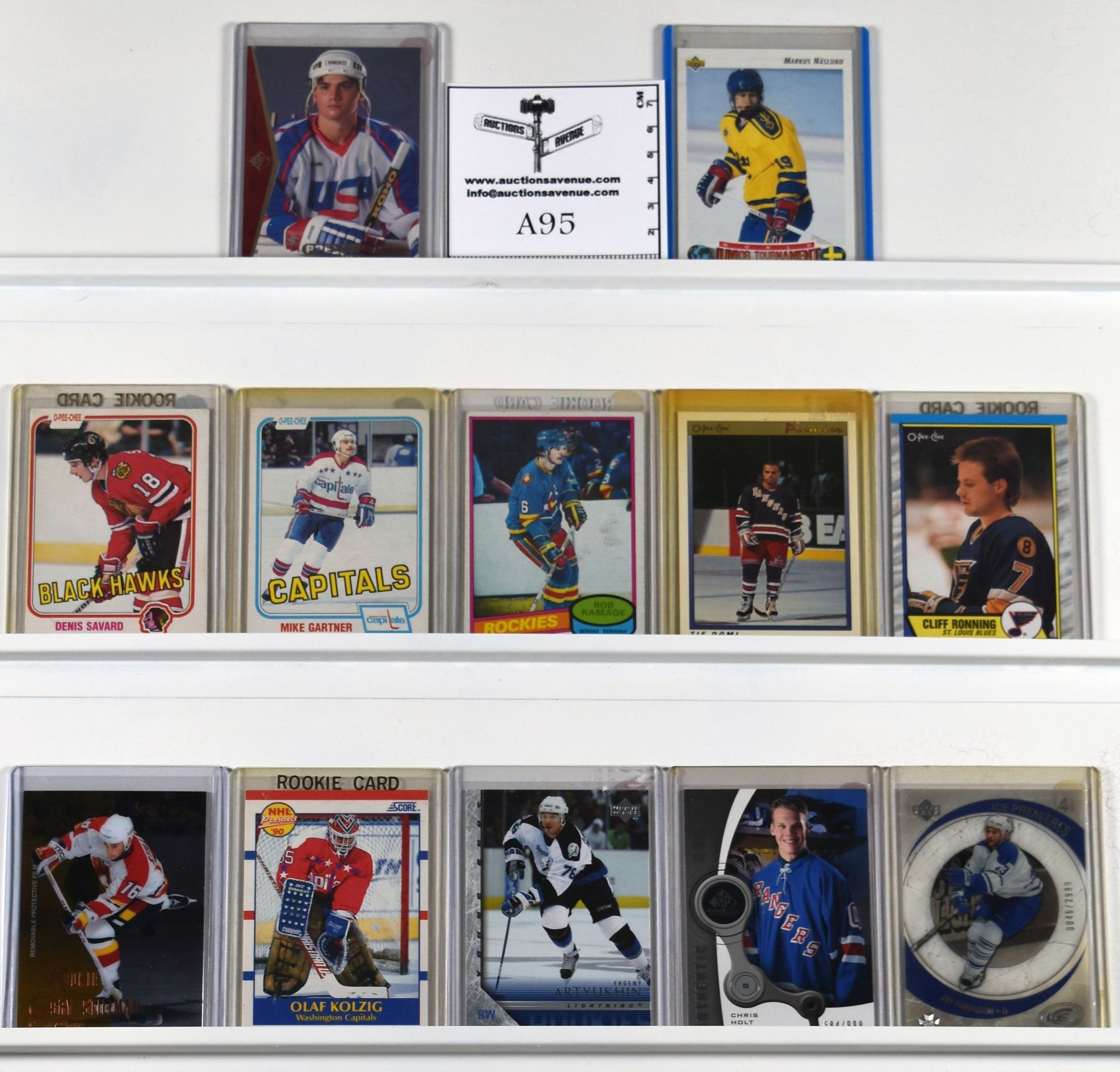 12 Rookie Cards, including Markus Naslund, Dennis Savard, Mike Gartner, Rob Ramage, Tie Domi, Cliff Ronning, Olaf Kolzig