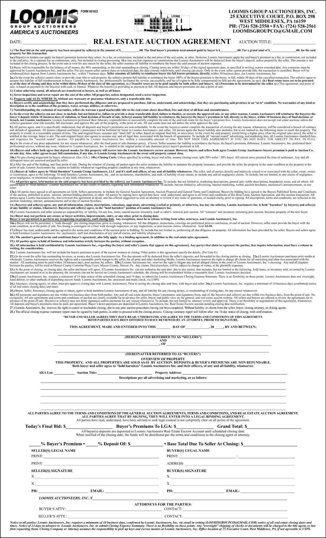All real estate deposits and buyer’s premiums, must be paid in full within 2 business days, with the signed auction real estate agreement. All agreements are published on site, far in advance to the end of auction for review. Loomis Auctioneers reserve the right to delete, deactivate, deny, cancel, any bidder for any reason, whatsoever.