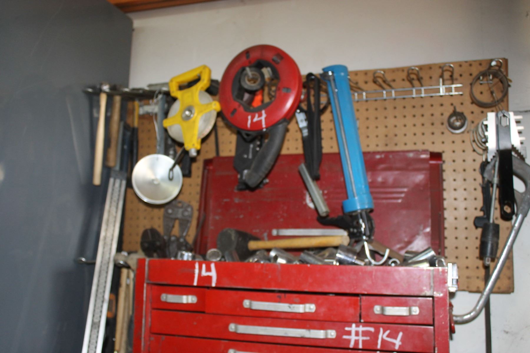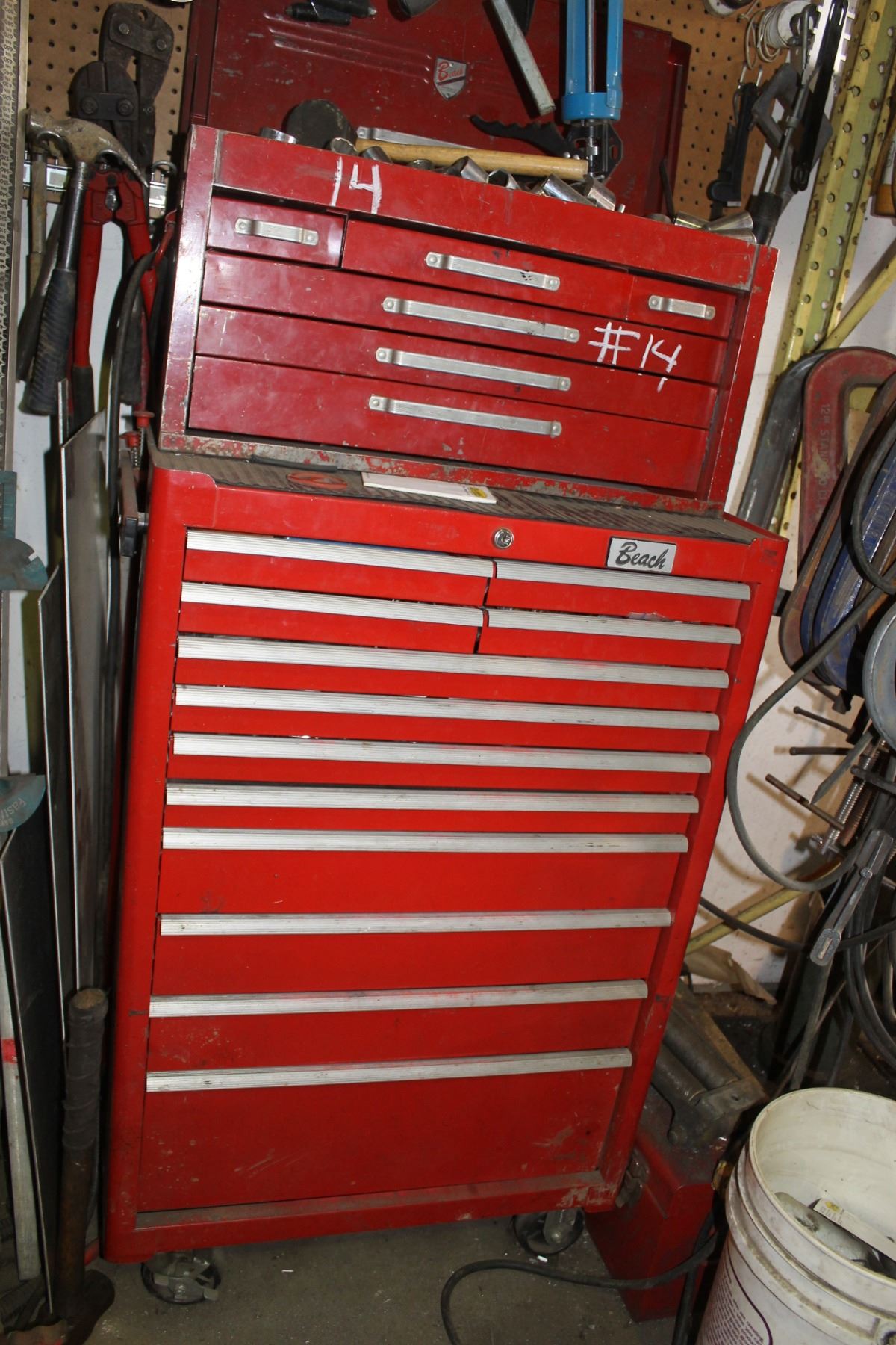 RED BEACH 18 DRAWER CABINET C/W ALL TOOLS, JACK ALL, HAMMERS & TAPE LINES