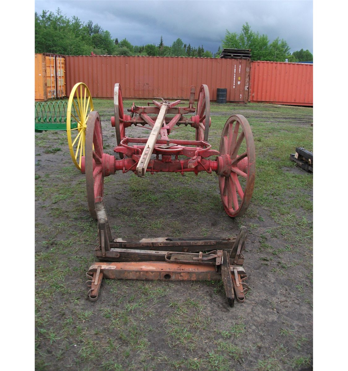 RED HIGH WHEELED WOOD WAGON WITH PULL HITCH AND BUNKS