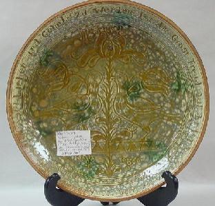 with "sgraffito" incised center: "mother with three tulips" and around the border: "lieben und geliebt zu werden 1st pie grost frend auf erden, made in Stahl's Pottery, Sept. 29, 1938", diameter 10". Condition: one small flake rim chip noted.