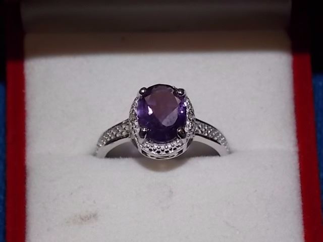 RING - 1.75CT OVAL FACETED AMETHYST & 2 DIAMONDS IN STERLING SILVER SETTING - INCLUDES CERTIFICATE $300
