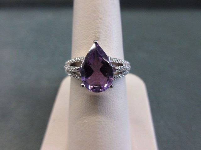 RING - 2.2CT PEAR FACETED PURPLE AMETHYST & 2 DIAMONDS IN STERLING SILVER SETTING - RETAIL ESTIMATE $350