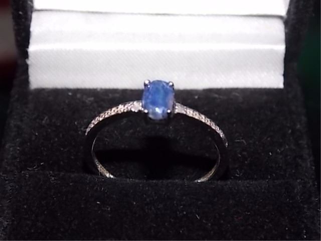 RING - OVAL FACETED BLUE SAPPHIRE & 2 DIAMONDS IN STERLING SILVER SOLITAIRE DESIGNED SETTING - RETAIL ESTIMATE $350
