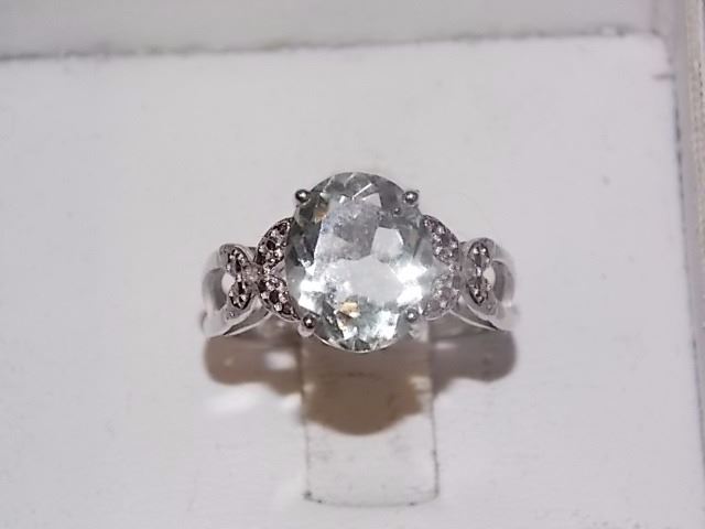 RING - OVER 3CT OVAL FACETED LIVELY GREEN/YELLOW AMETHYST & 2 ROUND FACETED DIAMONDS IN STERLING SILVER 4 CLASP DESIGNED SETTING - RETAIL ESTIMATE $425