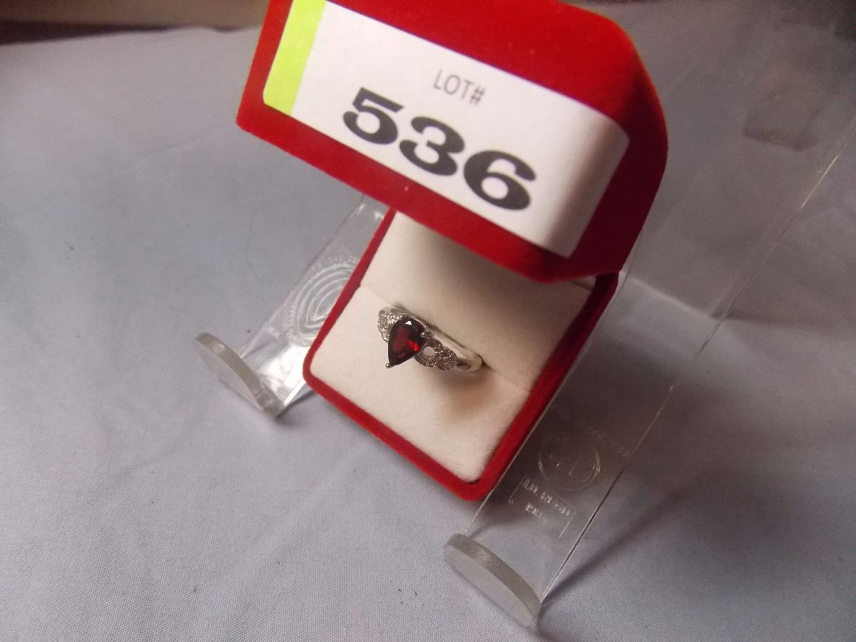 RING - PEAR FACETTED GARNET & DIAMOND IN STERLING SILVER SETTING - RETAIL ESTIMATE $345