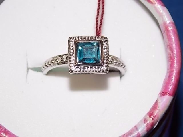 RING - STERLING SILVER & SQUARE CUT BLUE CRYSTAL IN STERLING SILVER SETTING - SZ 7 - RETAIL ESTIMATE $100