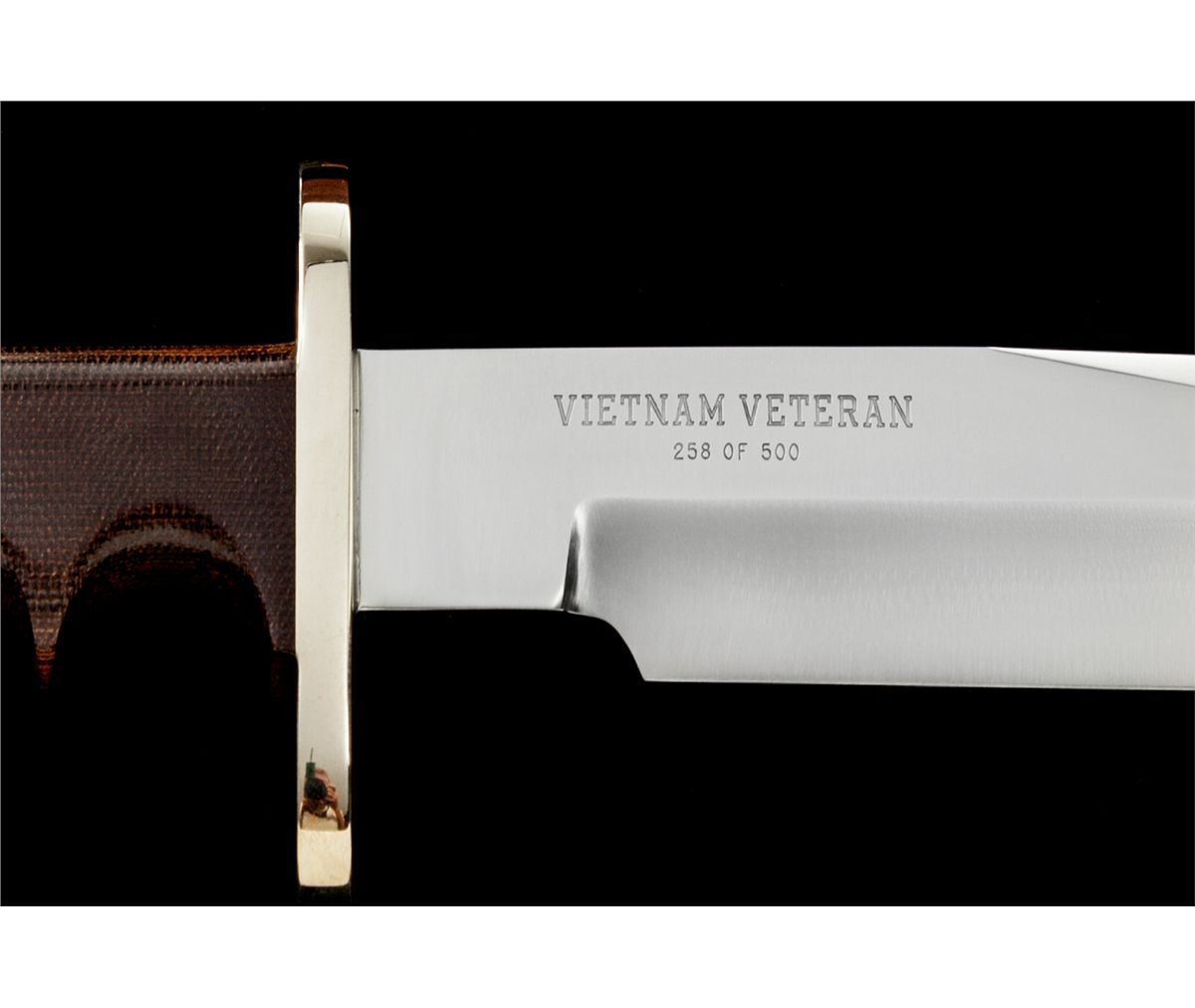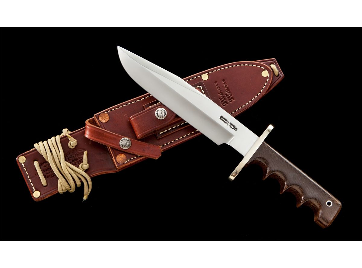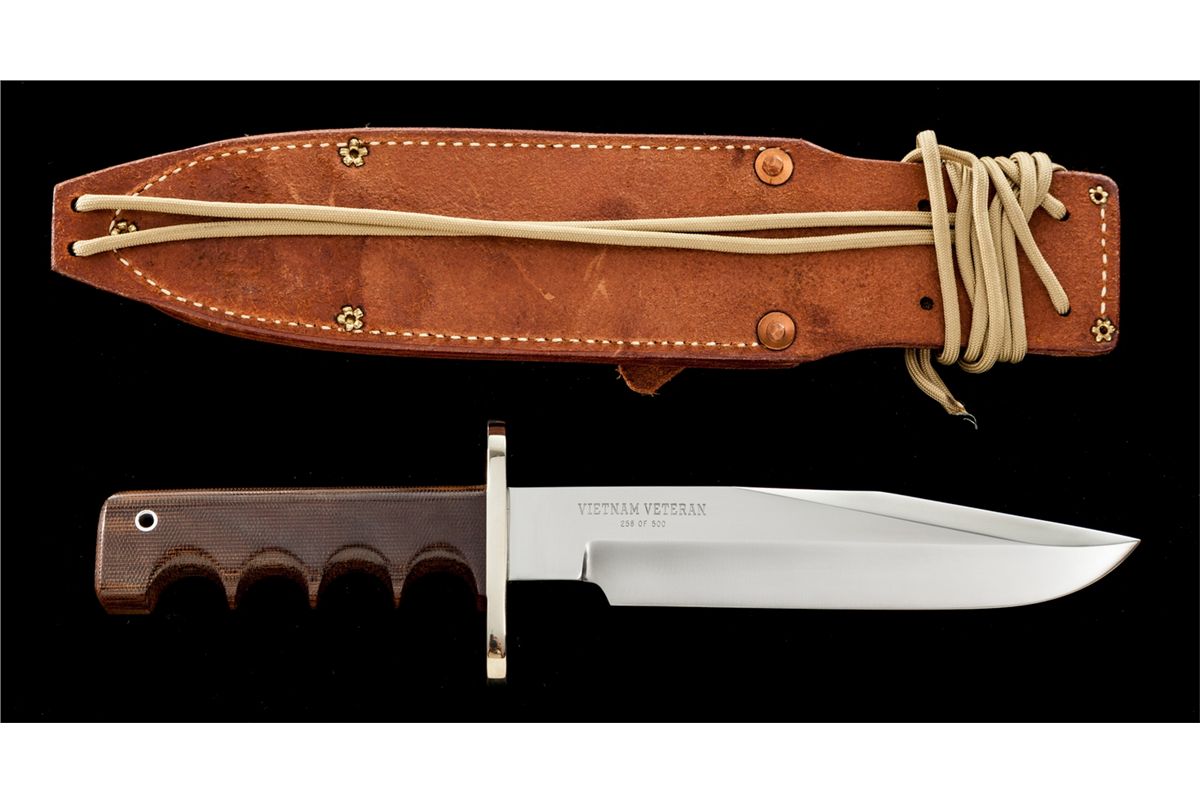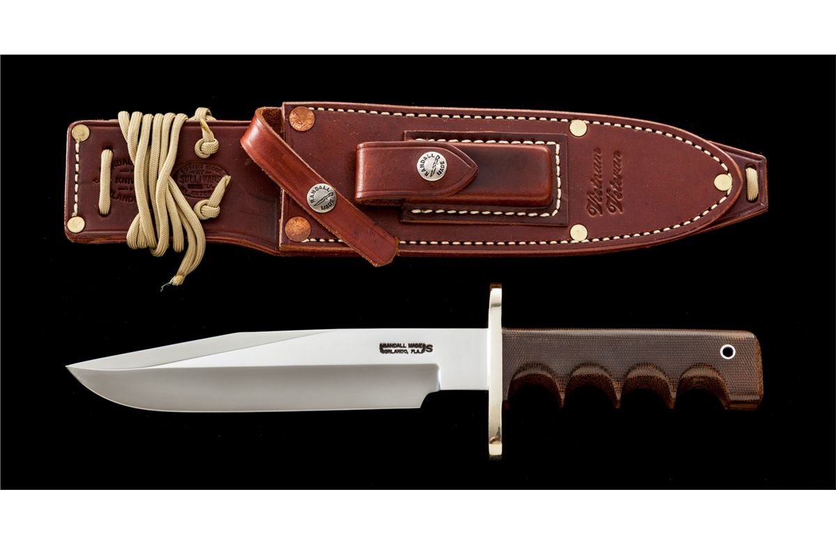 Scare and Desirable Limited Edition Randall Viet Nam Veteran Commemorative Model 14 ''Attack'' Knife, 7-1/2'' stainless steel blade is marked ''RANDALL MADE/ORLANDO FLA.'' with ''S'' marking for ''stainless''. The reverse is marked ''Vietnam Veteran'' and ''258 of 500.'' The overall length is 12-1/8''. Finger grooved brown micarta handle, nickel silver full guard, and stainless ferrule. Brown leather Sullivan sheath is stamped on the front side of the belt loop with both the ''Randall'' and ''Sullivan'' logo and is also stamped ''Vietnam Veteran'' near the tip. ''Randall Made'' snaps, brass and copper rivets, yellow wrist thong, and unmarked gray sharpening stone. Condition is excellent, showing no use. Nickel silver guard with light micro-scratching. Sheath with crisp snaps, tight stitching and seams. Est.: $800-$1,200.