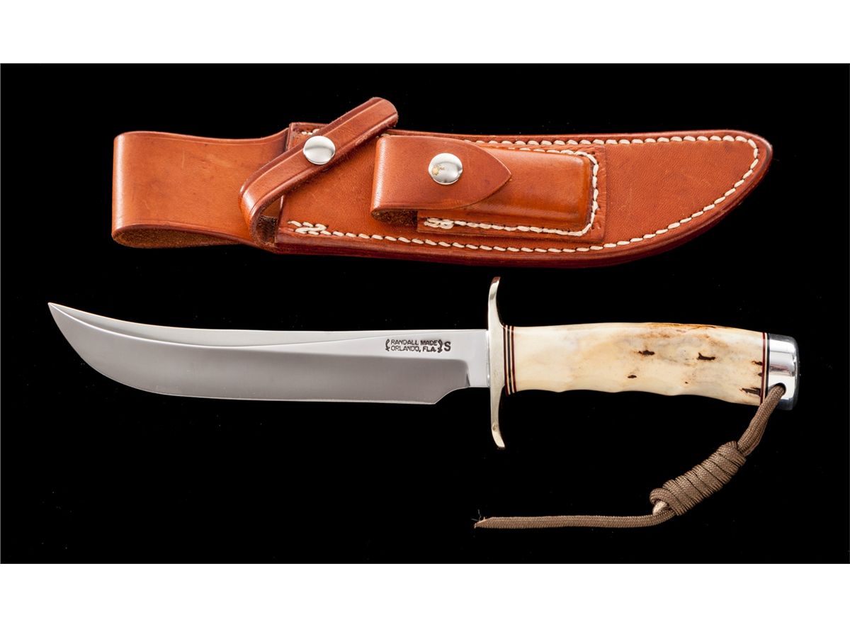 Late '70s-Early '80s Randall Model 4 ''Big Game Skinner'', 7'' stainless steel blade is marked ''RANDALL MADE/ORLANDO, FLA.'' with ''S'' marking for ''stainless''. The overall length is 11-3/4''. Finger grooved stag handle with colored spacers, nickel silver full guard and aluminum pommel, with a green wrist thong. Johnson rough back sheath stamped with the ''Randall'' football-shaped logo and ''4-7'' on back side of belt loop, smooth snaps, and a salmon colored sharpening stone. Condition is excellent showing very light use. Nickel silver parts with fine micro-scratching. Est.: $500-$750.