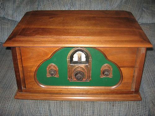 The sloped front panel of this traditional 1920’s shaped box has an opening for the front panel unlike any other radio I have seen. The brass dial escutcheons for the single-dial control and two potentiometers foreshadow the shape of radios to come in the next three to seven years. They look amazingly like jukeboxes or cathedral style radios of the 1930’s. While advertisements appeared throughout 1928 I have only seen one other example of this set. This one has a green front panel. This set is in nice condition inside and out except for the dial spools. no tubes
