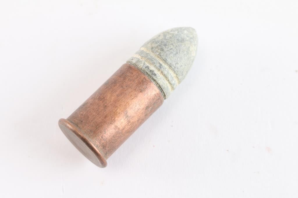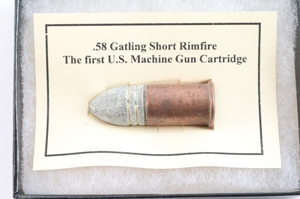 Reads "The First Machine Gun Cartridge." In display box, measures 4 1/4" x 3 1/4" x 3/4".