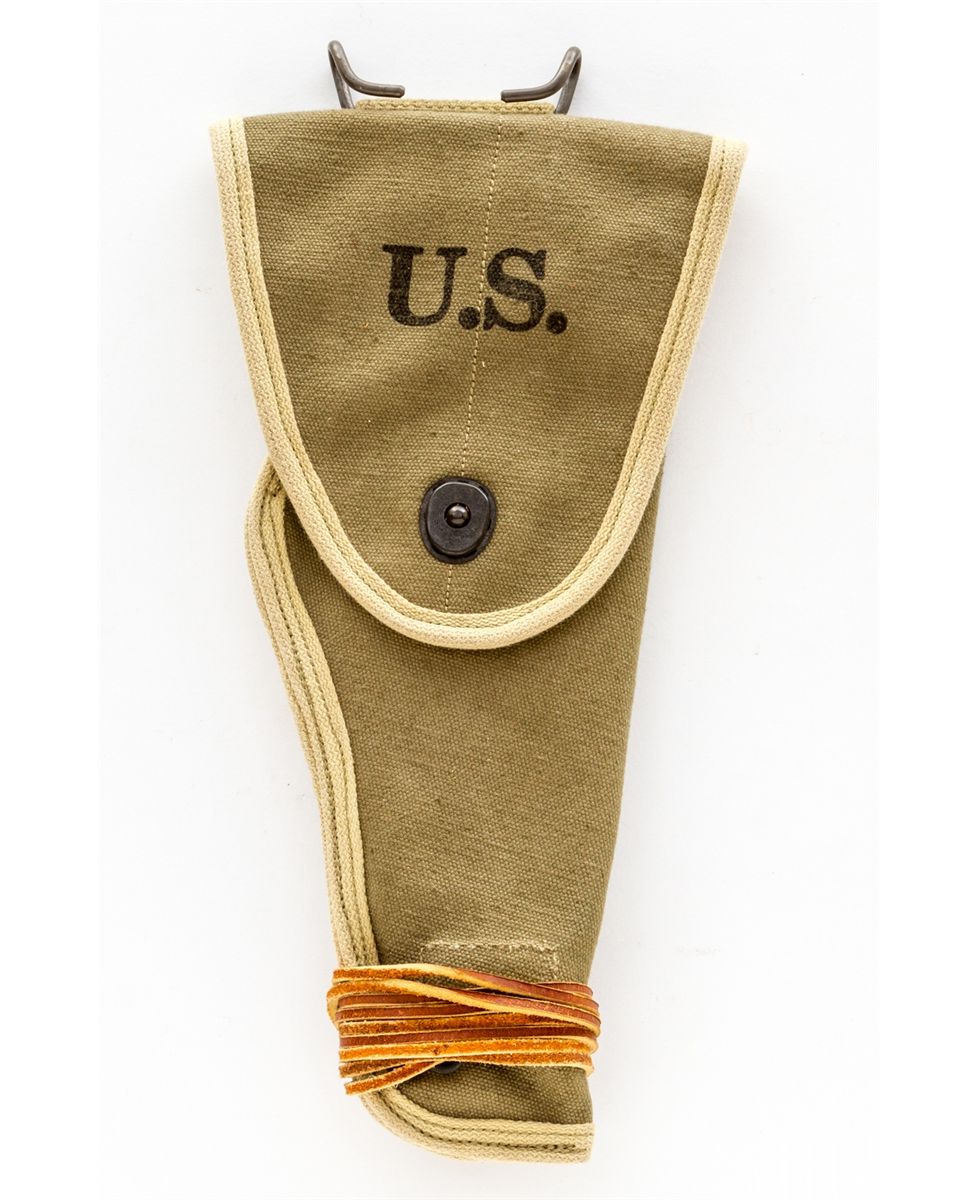 Rare Canvas M1 Holster for Model 1911-A1 Semi-Automatic Pistol, with leather thong, U.S. markings with star-pull lift-the-dot fastener, and black and brass hanger. Originally mfg'd in 1932 with just 54 produced -- one prototype, three samples, and 50 for trial. As pictured on page 294 of Scott Meadow's book, ''U.S. Military Holsters and Pistol Cartridge Boxes''. Condition is excellent. Est.: $800-$1,200.