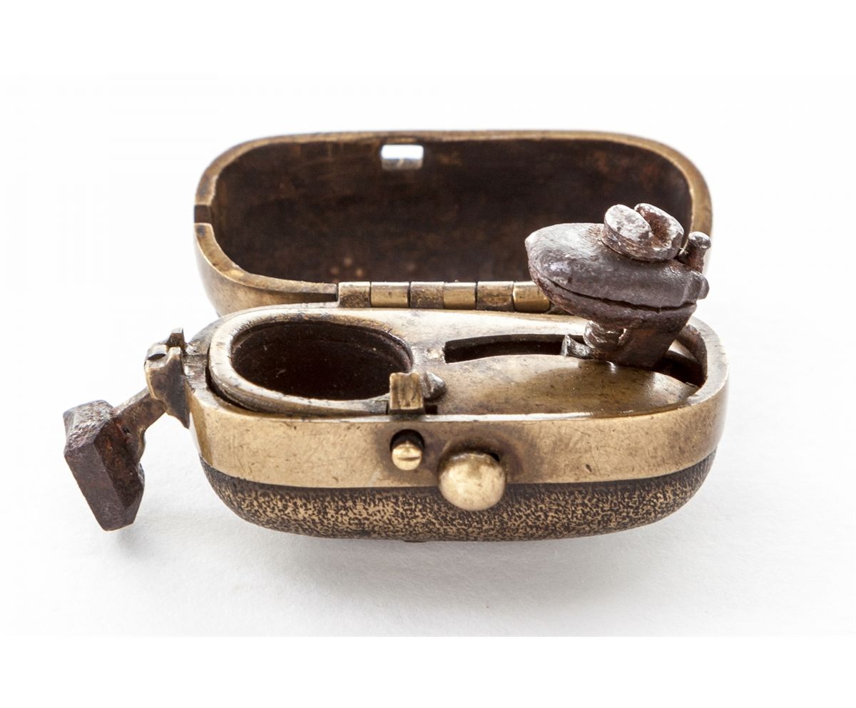 Rare Japanese Flintlock Netsuke Tender Starter, or ''Hi-uchi Bukuro''. Body made of a soft metal brass alloy with silver and copper flower decorations. Dating from the Edo period (1603-1868) and used as a lighter for fire starting or to light the match wick for the Tanegashima rifle. Formally found in iron, soft metal examples tend to be attributed to higher ranking samurai or noblemen. Spring-loaded lock with flintlock type hammer and snaphaunce style frizzen striking plate. Condition is excellent showing some patination. Mechanism is in working order with release button. Est.: $1,000-$1,500.